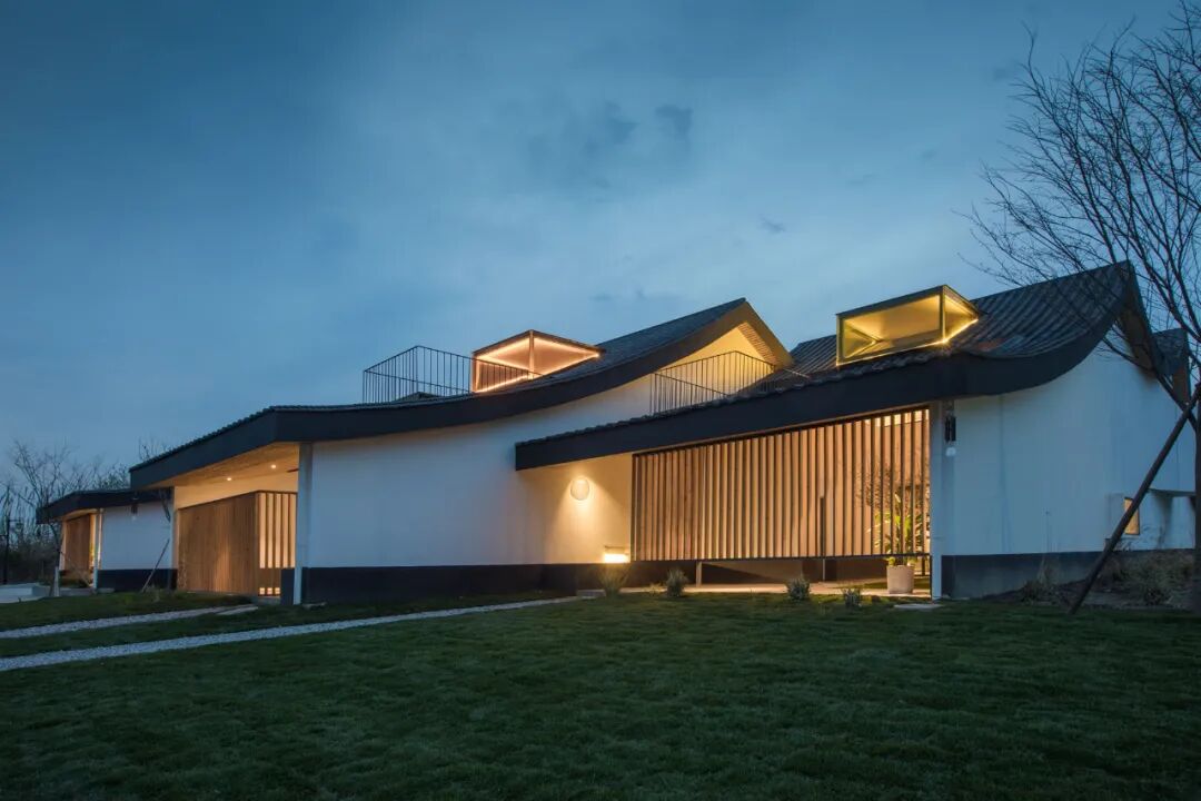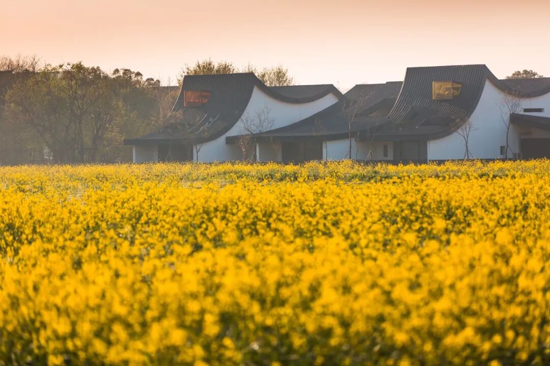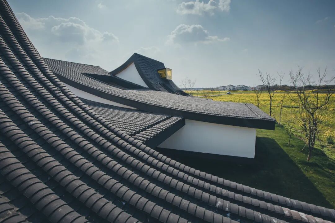 在诗意如画的江南水乡,稻田理想将自然景观和建筑设计完美融合。波浪形屋顶,南北向错动形成了一个天际线丰富的小型建筑群落,从远处看就像一本本扣立在稻田上的书本,白墙青瓦连绵起伏,光影交错相互辉映。