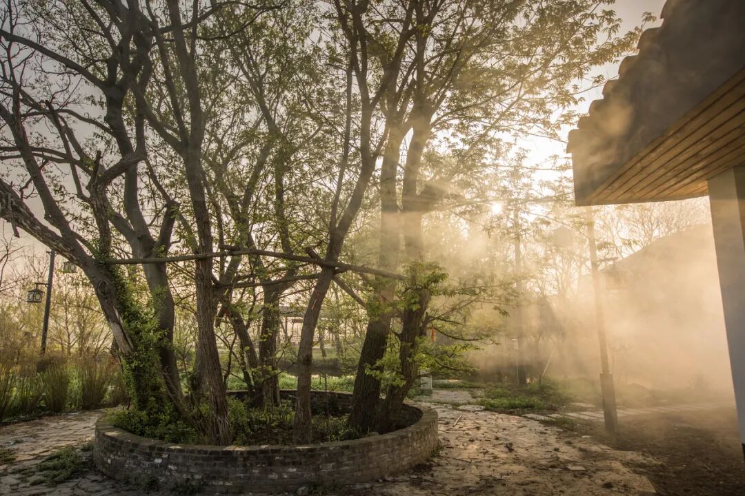 稻田理想精品民宿共四座独栋小院和一间咖啡厅。院前是农家鱼塘,倒映房屋草木。院旁是葱茏繁茂的草坪绿树,清晨阳光穿过树枝透过薄雾,把阳光洒在墙壁屋檐,光影斑驳星星点点,自然渲染出小桥、流水、人家的诗意乡村生活意境。