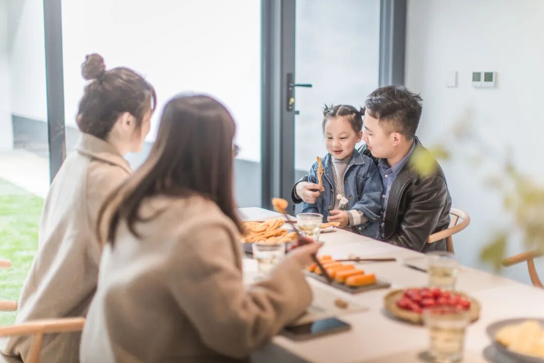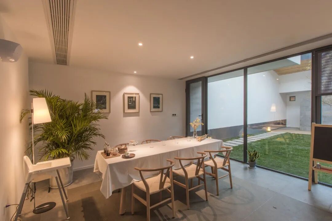 客厅前后整墙为透明玻璃窗、门,与中院空间连接,光线通透明亮。沙发、茶几、电视机、餐桌椅等家居设施一应俱全,可以窝在沙发上放松小憩,也可以亲朋好友尽情谈天说地,享受家一样的惬意时光。
