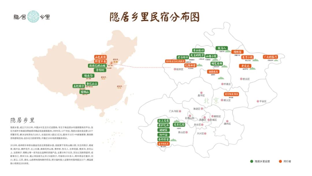 隐居乡里,诗意地回到乡村,专注于高品质乡村度假服务。从2015年开始,在北京、河北、陕西、四川、贵州、江苏等地,已陆续改造并成功运营了山楂小院、姥姥家、麻麻花的山坡、青籽树、楼房沟、杏花山上、梧桐山、稻田理想等多个知名民宿项目。截至2021年4月,隐居乡里成立六年已改造运营150个闲置农宅,累计接待15万余人次。未来还会在山西、重庆、河南、湖北、陕西等地落地新的项目,预计届时投入运营的村落将超过30个,精品度假小院将达200多家。