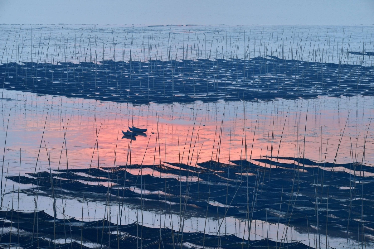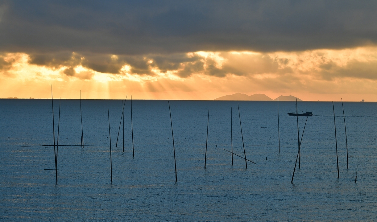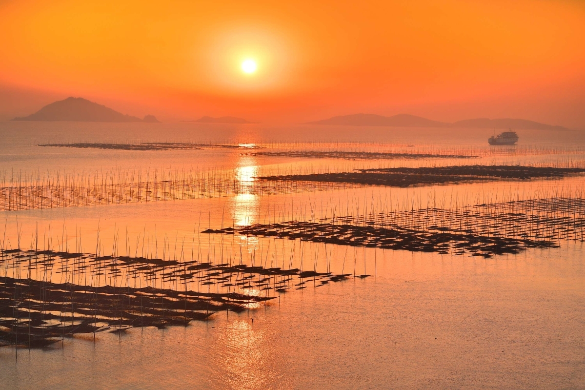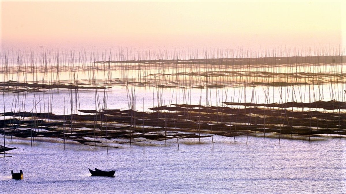 湾内风平浪静,海岸线绵延曲折,滩涂风光旖旎。渔排木屋、小舟鱼网、浮标竹竿……,四季潮汐,天光云影。随着季节和天气变化呈现出不同景致。
