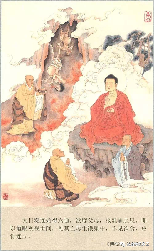 目犍连尊者见母亲因生前造恶业在地狱备受煎熬,悲痛不已,发愿救母。虽然他是佛弟子中的神通第一,却因其母罪障深重而无力援手。目犍连哀痛,祈求于佛陀。佛陀告知,在农历七月十五日以五谷、香、油供奉十方诸佛,以此功德令母亲脱离恶道。