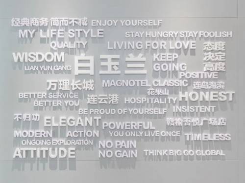 立于前台的“万理长城”文化墙,巧妙地将白玉兰品牌对精致生活的昂扬态度以及“一城一店一品”的品牌特色融入到酒店设计中,“花果山”“连岛海滨”等各种标签,带领顾客了解“风情赣榆”的同时也丰富了酒店的文化内涵。