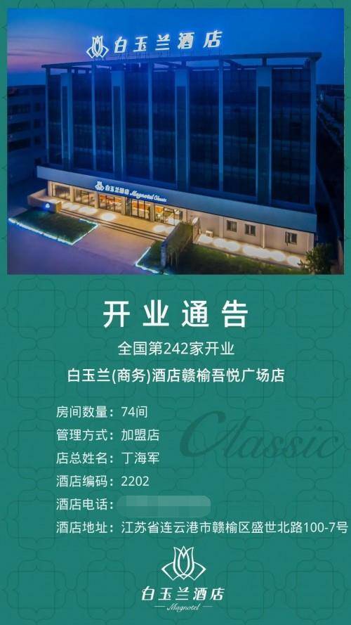 2022年9月,锦江酒店(中国区)旗下优选服务酒店品牌“白玉兰酒店”连云港再添一员,迎来门店——白玉兰(商务)酒店赣榆吾悦广场酒店正式上线。这也是全国第242家开业的白玉兰酒店。