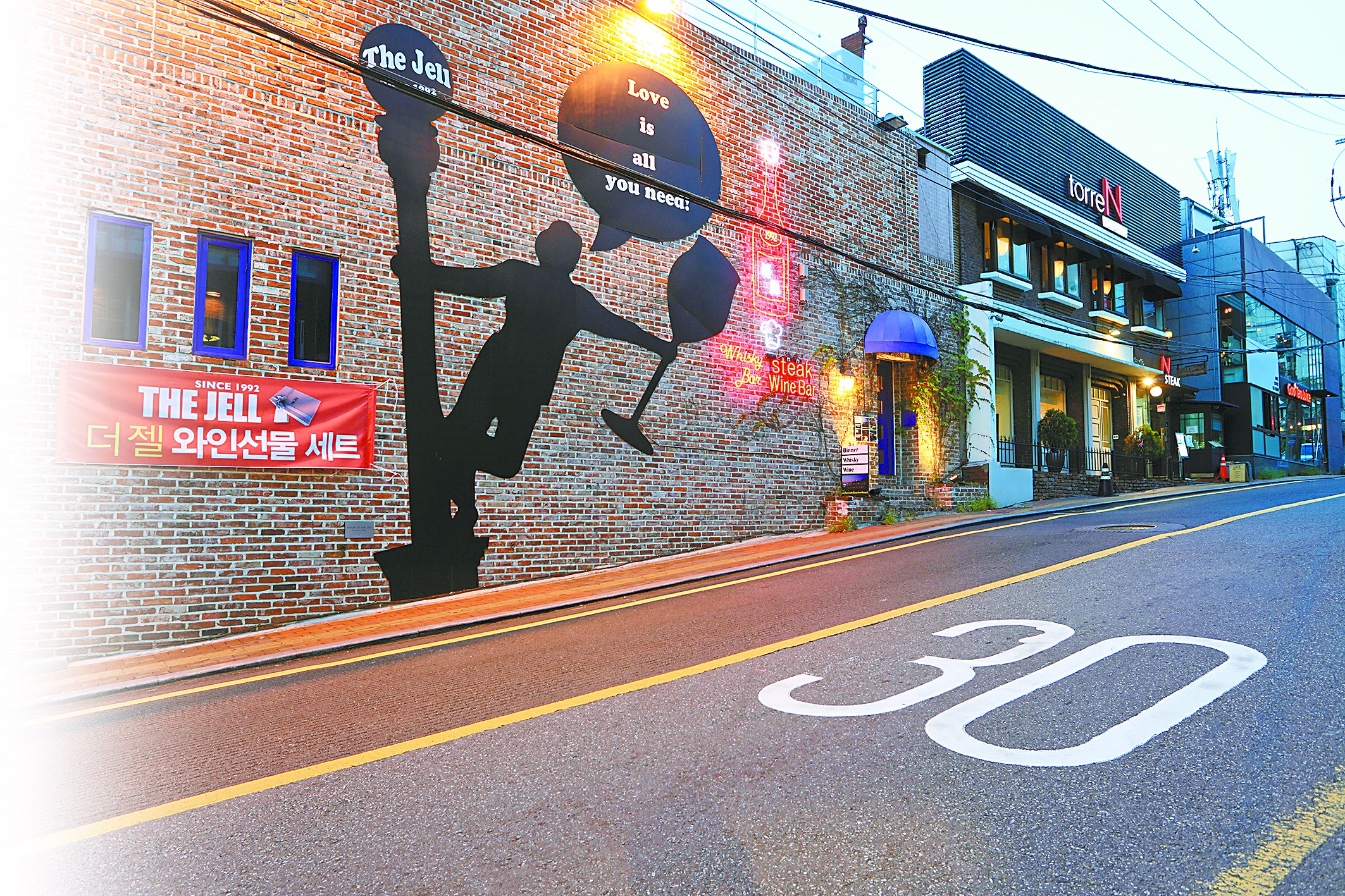梨泰院的房子都是依山而建,坡度比较大。记者对梨泰院的印象就是有爬不完的坡,多得吓人的上坡下坡,还有无止境的上楼梯下楼梯,每次去都走得脚抖,难怪大家要在咖啡店坐那么久。很多咖啡店都设在山坡上,坐在咖啡店的露台可以眺望南山塔。看夕阳徐徐落下,这是梨泰院咖啡店的特色之一。