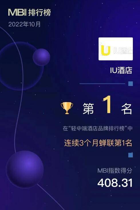 在迈点研究院刚公布的2022年10月酒店品牌影响力100强榜单中,IU酒店挺进榜单前30强,排位第26位;不仅如此,更是连续3个月蝉联 “轻中端酒店品牌排行榜”第一名,IU继续保持稳健发展势态,此份殊荣不仅彰显了IU酒店品牌实力,也是用户、行业与投资人对IU酒店的实力与口碑的双重认可。