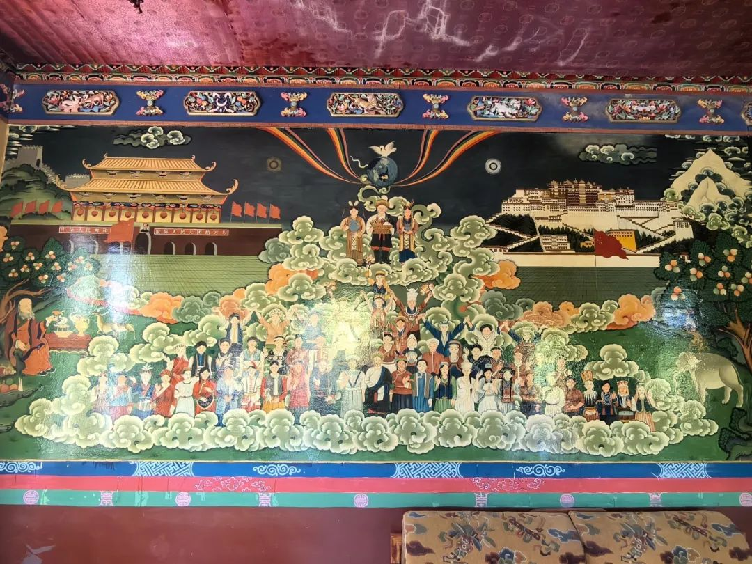 大厅中间是“民族大团结”大型壁画,技法丰富多变, 画法单线平涂,庄严肃穆,体态匀称,将历史故事和民俗风情一一展现。采用俯瞰式透视法,以几何结构描绘人物和建筑物,画面别具一格。