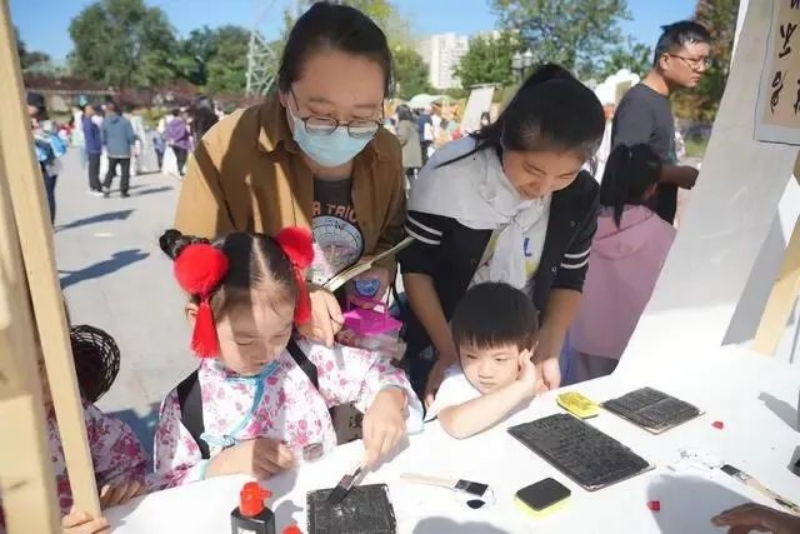 “枣”成语、猜灯谜等互动体验小车前人头攒动,家长们使出浑身解数去赢得挑战,孩子们开心地拿着赢来的铜钱去兑换参加纸捞金鱼、DIY香囊的机会。身着汉服的工作人员向每位参加活动的市民详细讲解着非遗传统,大家仿佛穿越时空来到古代热闹的市集,感受源远流长的枣文化和中国传统文化的魅力。