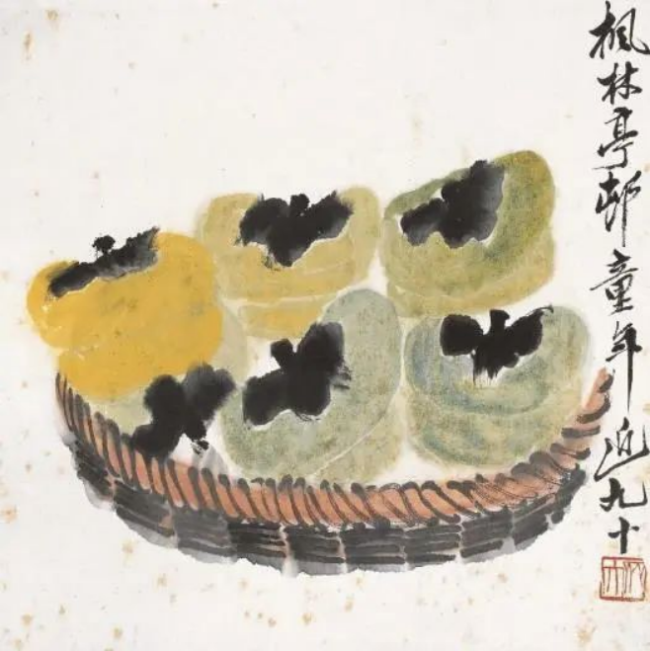 柿子,因有“事事如意”的象征,常入《岁朝清供图》。齐白石便有《六柿图》,绘巧置于篮中的六个柿子,设色朴雅,心静意清,用笔憨态纯厚,以秋实解秋意,自然天真,极富生趣。爱画柿子的齐白石,还自称“柿园先生”。