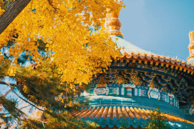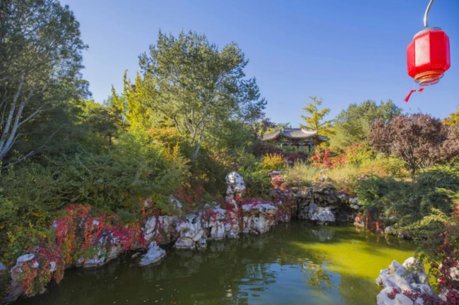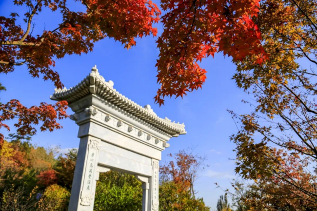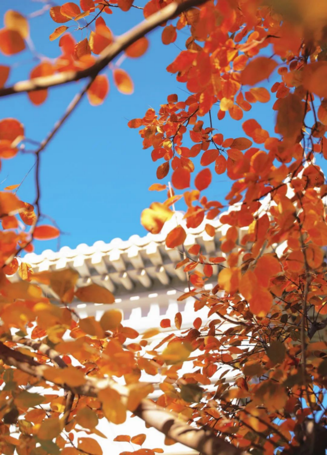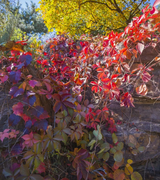 被深秋勾勒出金边的银杏,秋意入骨的槭树,红彤彤的黄栌与爬山虎,还有紫薇与天目琼花也加入秋日深浅浓淡的调色盘……