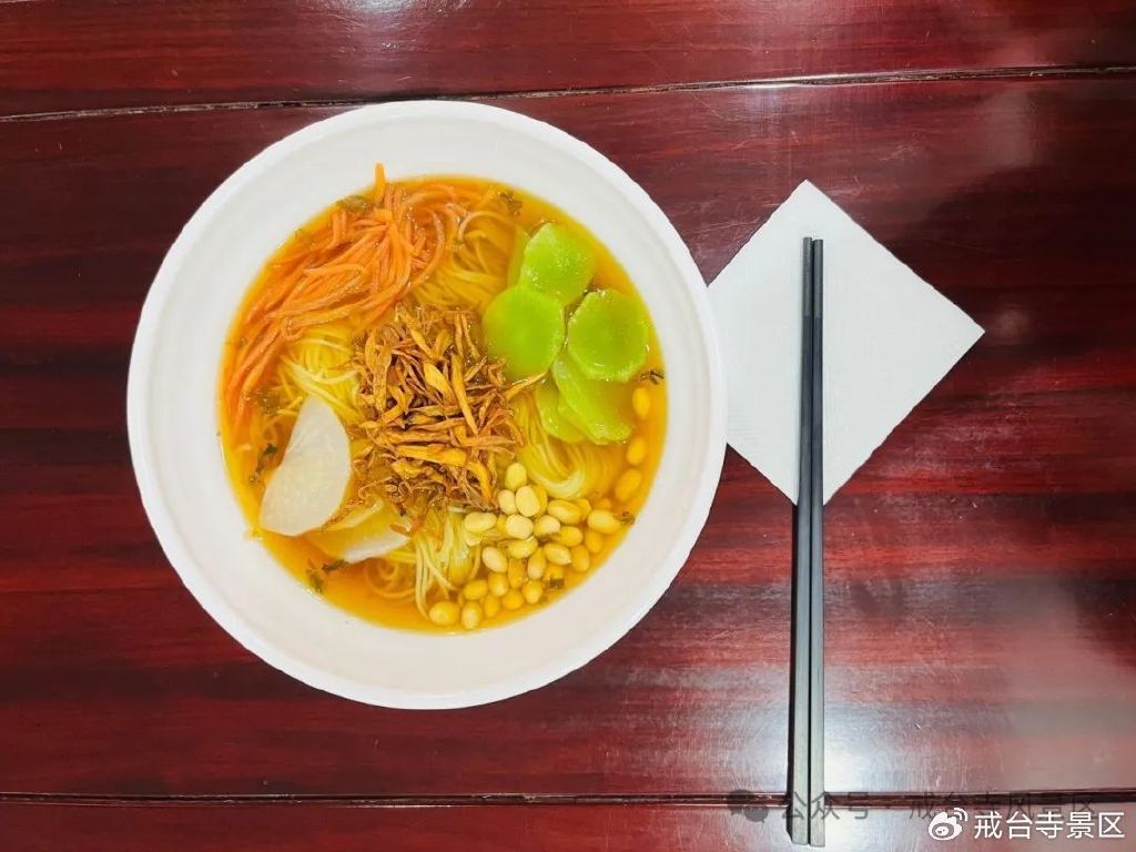 戒台寺素斋不仅仅是舌尖上的文化,更是心灵上的文化。大斋堂从2013年开始传承素斋文化,至今已有十余载,每天为游客提供古法罗汉斋和菌菇素面。古法罗汉斋凝聚传统技艺,食材丰富,味道鲜美,尽显素食文化底蕴。菌菇素面则以鲜美的菌菇汤搭配劲道面条,简单又美味。