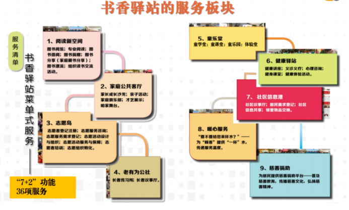 书香驿站团队根据书香驿站的7大板块服务功能,细化为“36项服务清单”,从阅读空间到社区信息港,可覆盖社区居民文化服务周期的需求。