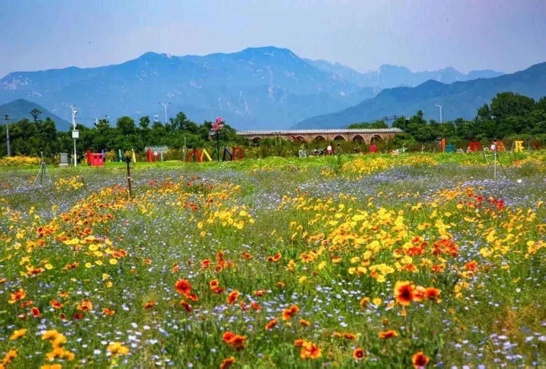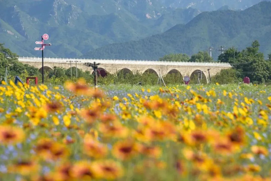 七孔桥花海位于昌平区昌赤路,当前,千亩花田如梦幻画卷般铺展,紫色的马鞭草、白色的波斯菊、灿黄的金鸡菊相互交织,与古朴的七孔桥、远处的青山相映成趣。