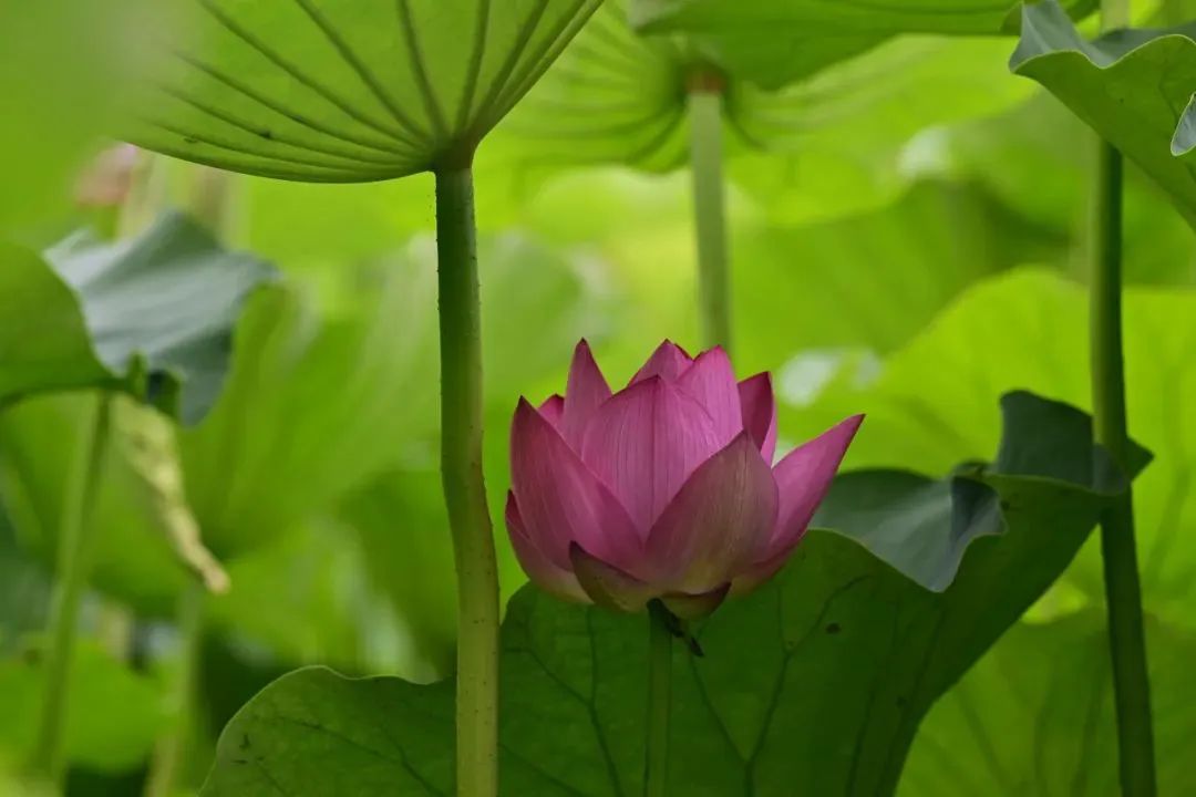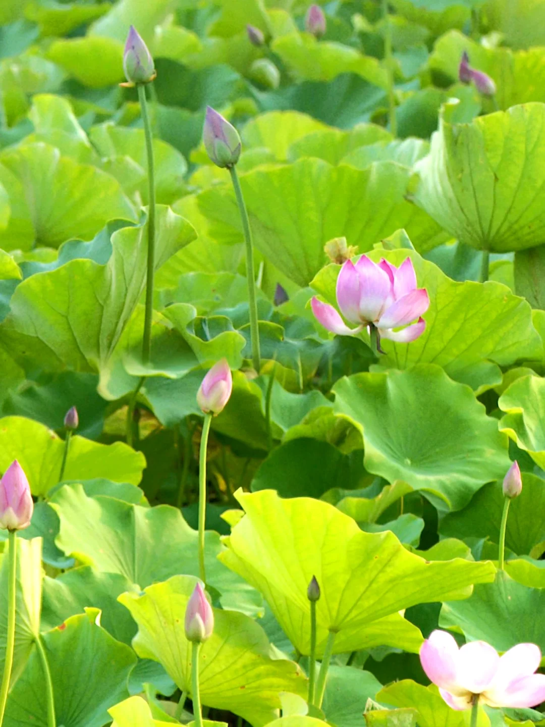 满池荷花各有各的姿态,有的含苞待放像蘸满胭脂的毛笔尖,有的半开半合犹抱琵琶半遮面,有的完全舒展尽情拥抱盛夏的明媚。