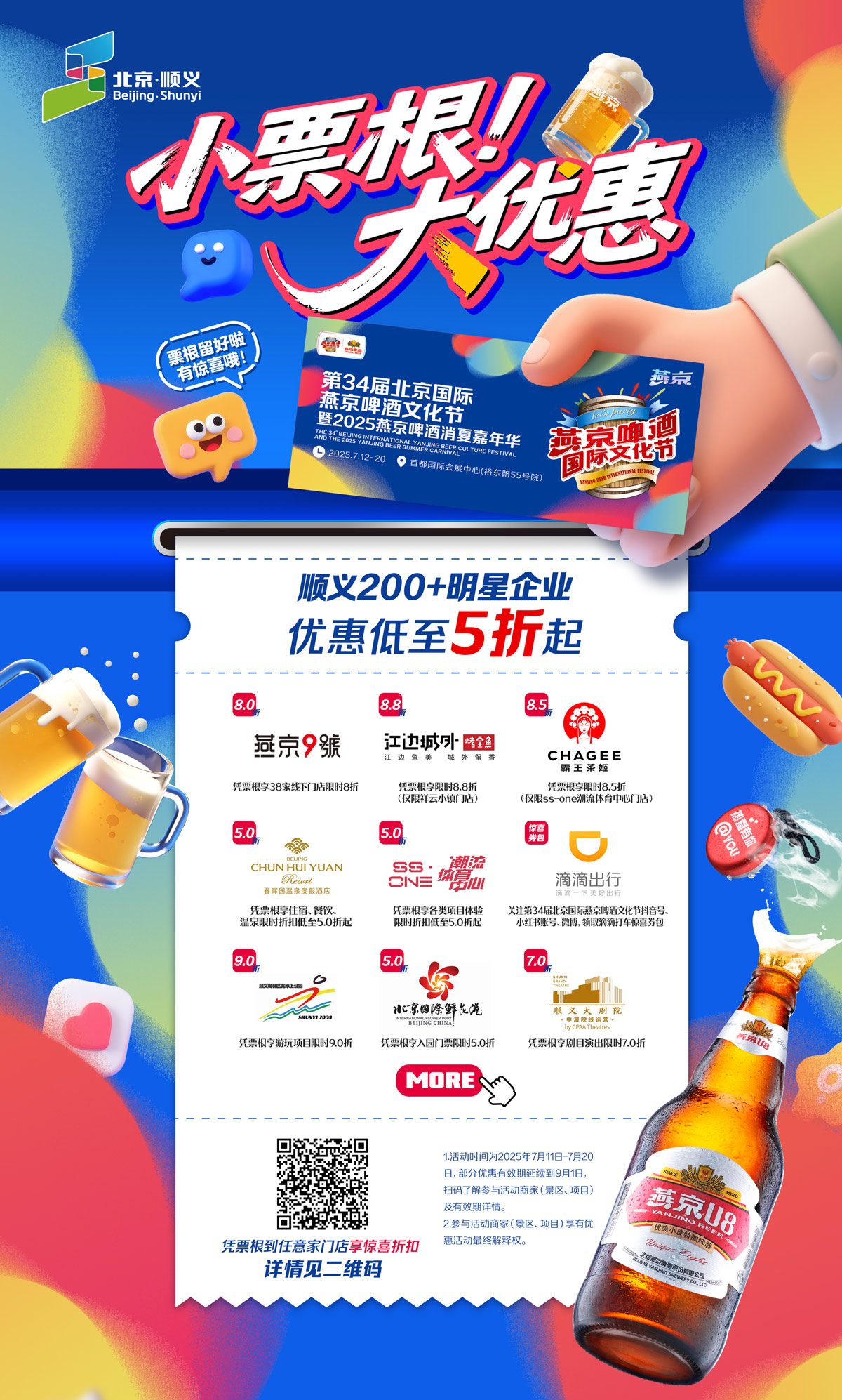 据悉,本次活动时间为7月11日至7月20日,部分优惠有效期延续到9月1日。更多活动详情可通过扫描票面二维码或关注顺义区相关平台获取。