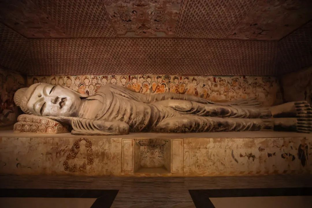 中唐第158窟:长达十余米的涅槃佛像静谧庄严,传递“寂灭为乐”的哲学意境;