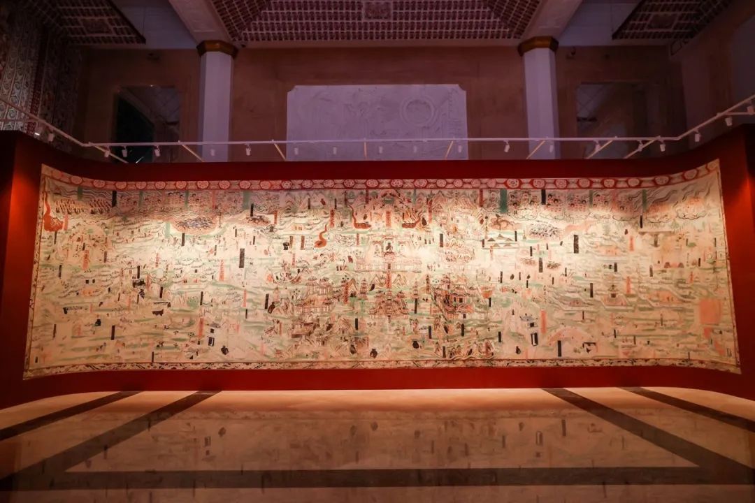 展览汇集敦煌研究院珍藏的文物真迹与临摹精品。文物方面,如唐代《佛顶尊胜陀罗尼经第一》、西夏文活字版残《诸密咒要语》、唐代古藏文《大乘无量寿宗要经》等,见证了敦煌作为丝绸之路文化枢纽的辉煌历史;壁画临摹作品方面,最具震撼力的莫过于五台山图。这幅出自莫高窟第61窟的巨幅壁画,面积达45.9平方米,是同类题材中规模最大的一件。此次展览将完整呈现这一杰作,为观众提供一个近距离欣赏和感受其艺术魅力的机会,领略敦煌壁画的艺术魅力。
