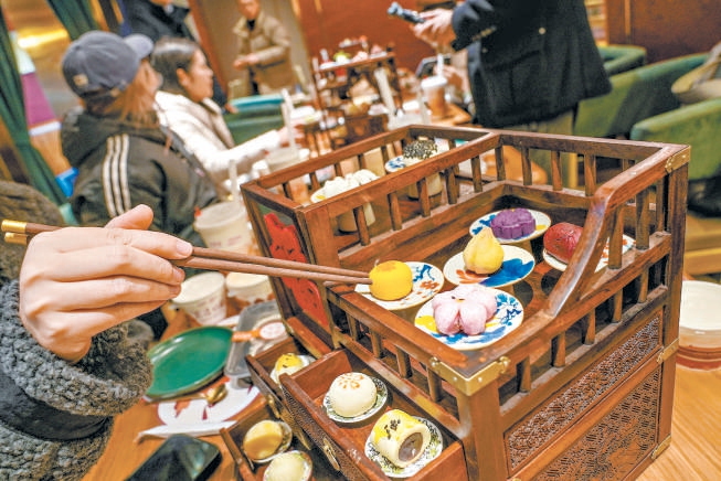 中午时分,艺术馆不远处的宫宴餐厅好不热闹,客人们早已在店内“妆造司”换好了装扮,端坐在舞台两侧桌前,一秒“穿越”回大唐盛世。悠扬的曲乐声响起,舞台上的汉舞演出开始,珍馐美馔一道道上桌,每道菜都有自己的故事。“真的有宫廷用膳的感觉呢。”一位游客评价道。