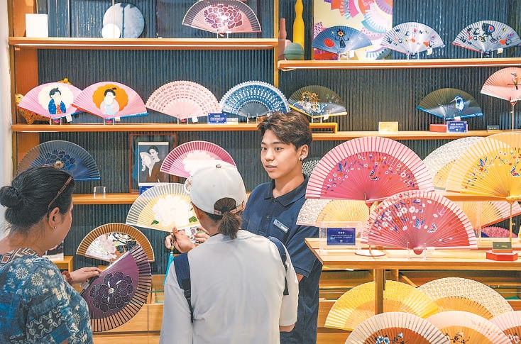 扇子源于中国,有四千年左右历史。老街上的京扇子店铺,可以一站式打卡各式折扇,华谊牡丹系列折扇是最受欢迎的“大热单品”。“扇骨是用6到8年生的头青竹进行高温染色,扇面采用真丝双面漆绘工艺。”京扇子总经理张宇说,境外游客尤其喜欢这类刺绣产品,“我们也是用现代化产品,向他们展现中国古代手工艺。”