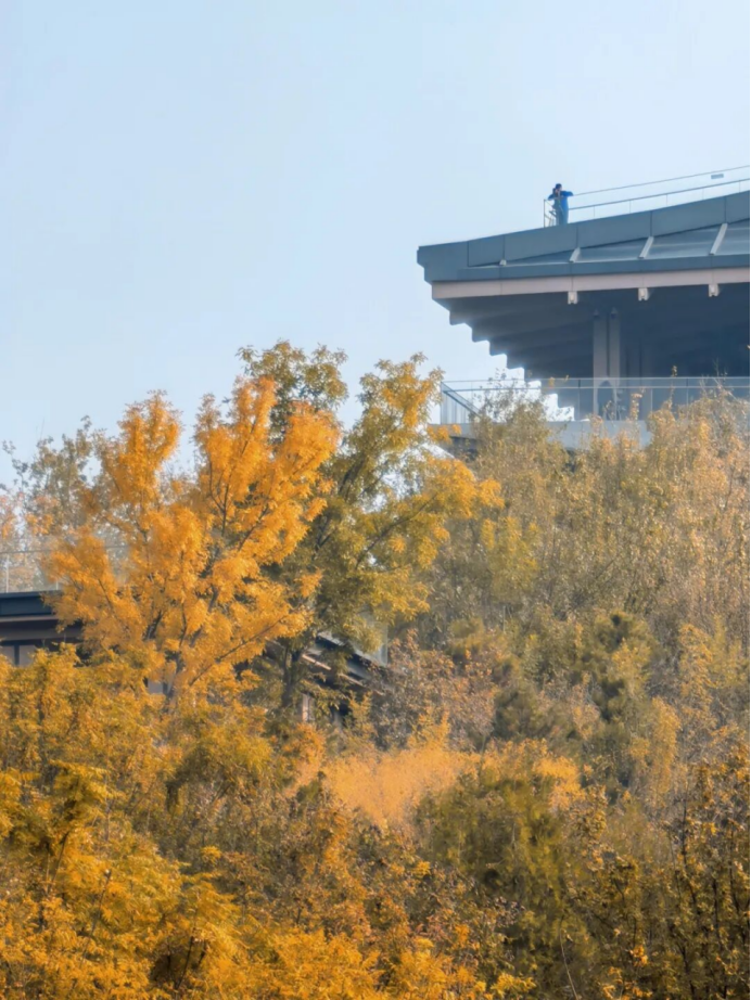 站在九层极目远眺,园博湖与莲石湖构成的湖光塔影尽收眼底,远处北京城廓与西山轮廓相映成趣,银杏大道金黄耀眼,红叶倒映在湖面上,拍出来宛如画卷铺展。