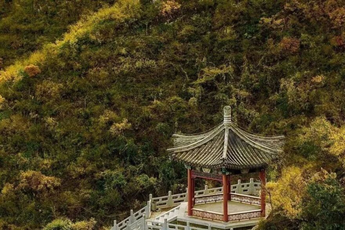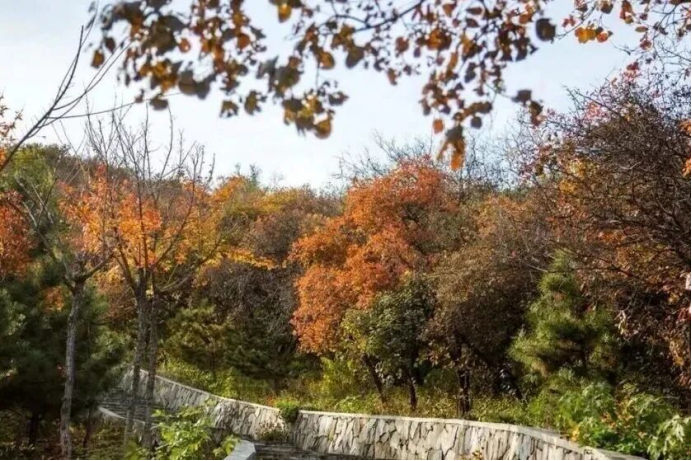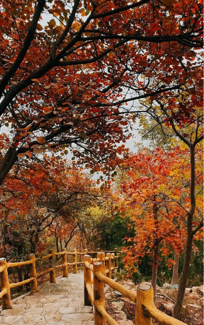 此时的千灵山,正铺展着最动人的秋日长卷。浅黄、橙红、深绛的枝叶在山间交织,山风拂过,落叶轻舞,踩上去足音轻碎,满是秋的诗意。
