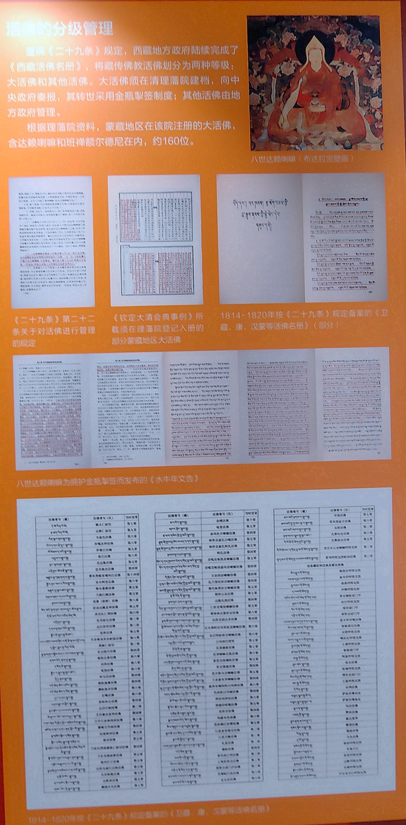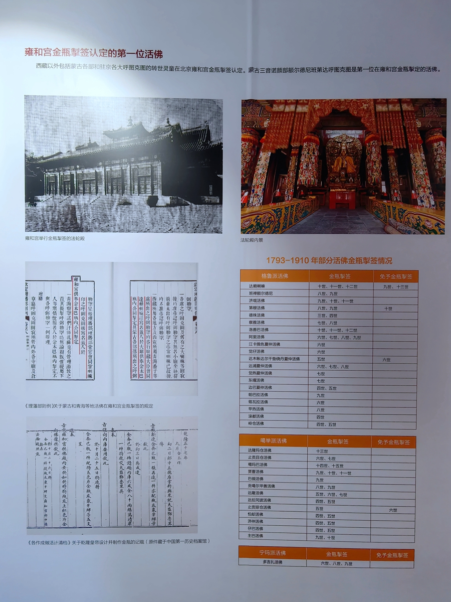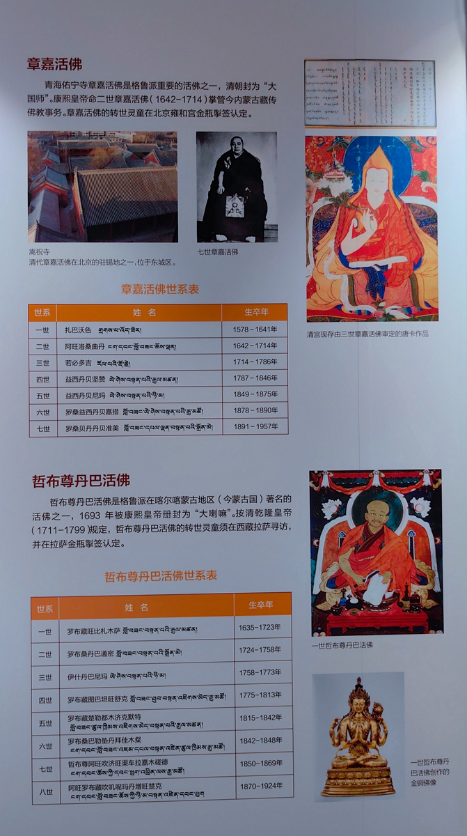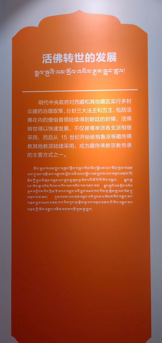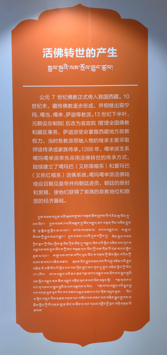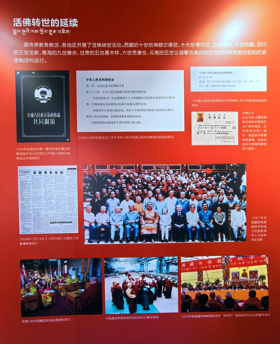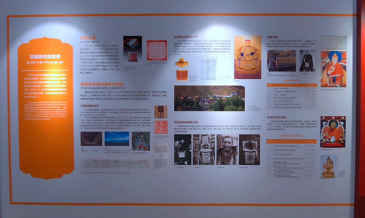 活佛是指藏传佛救一些高僧的转世,部分活佛在宗教和社会上享有较高的地位。佛教认为,一切生命由躯体和灵魂组成,躯体虽可消亡,但灵魂在六道中不停轮回转生;得道的诸佛、菩萨为普度众生可以随缘化现为各种形象。在藏语中,活佛称为“朱古”,意指佛菩萨的化身。活佛转世自 13 世纪末由噶举派创立以来,经过不断的发展,逐渐成为藏传佛教宗教首领特有的一种传承方式,形成了众多活佛系统,并陆续形成了一套比较完整的宗教仪轨和历史定制。一般而言,前世活佛圆寂后,其转世需经寻访、认定和坐床等程序。历代中央和地方政府高度重视活佛转世,并对其进行管理。达赖喇嘛和班禅额尔德尼等大活佛的转世须经中央政府批准和册封。此次展览,旨在普及藏传佛教活佛转世的知识,讲明活佛转世的产生与发展,及其认定的宗教仪轨和历史定制。