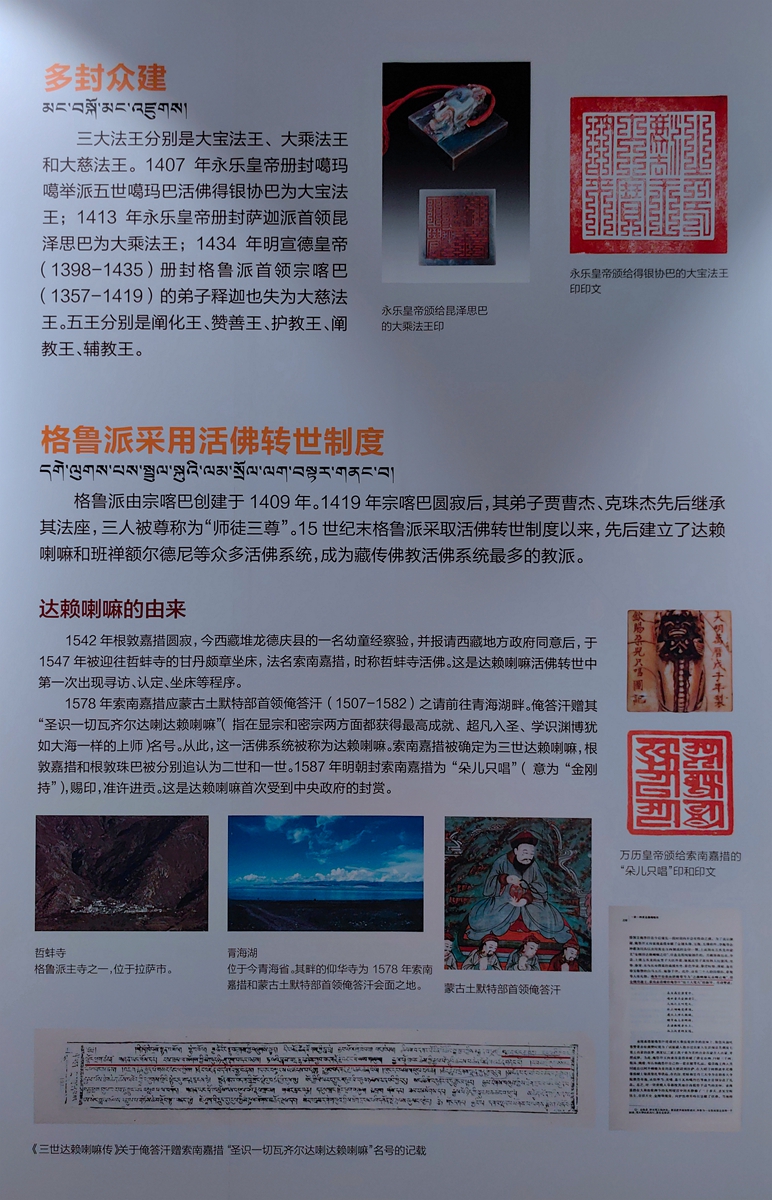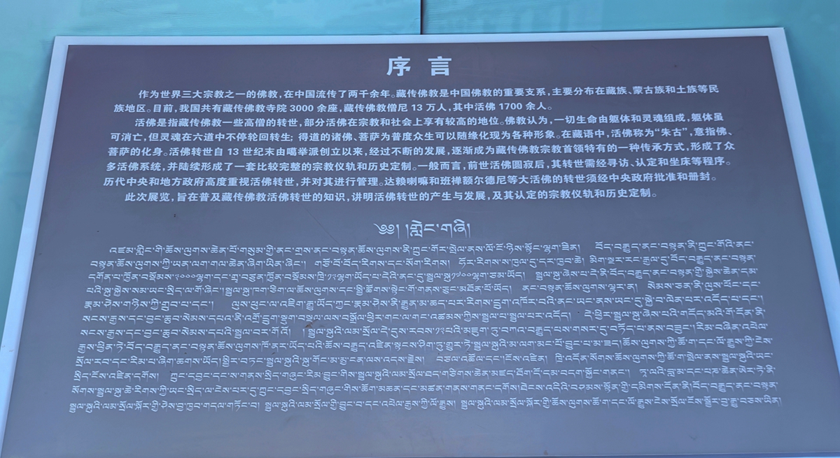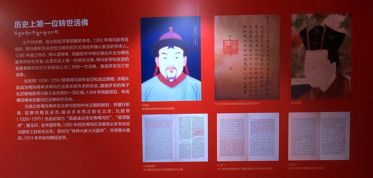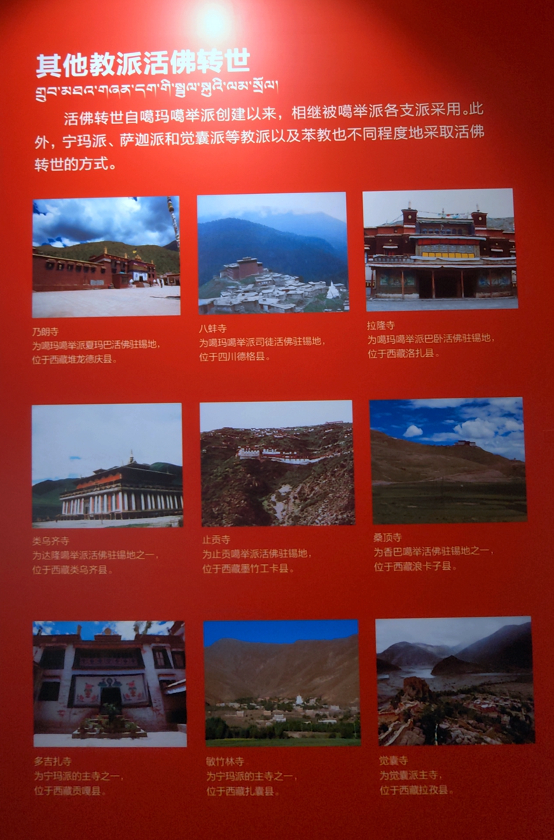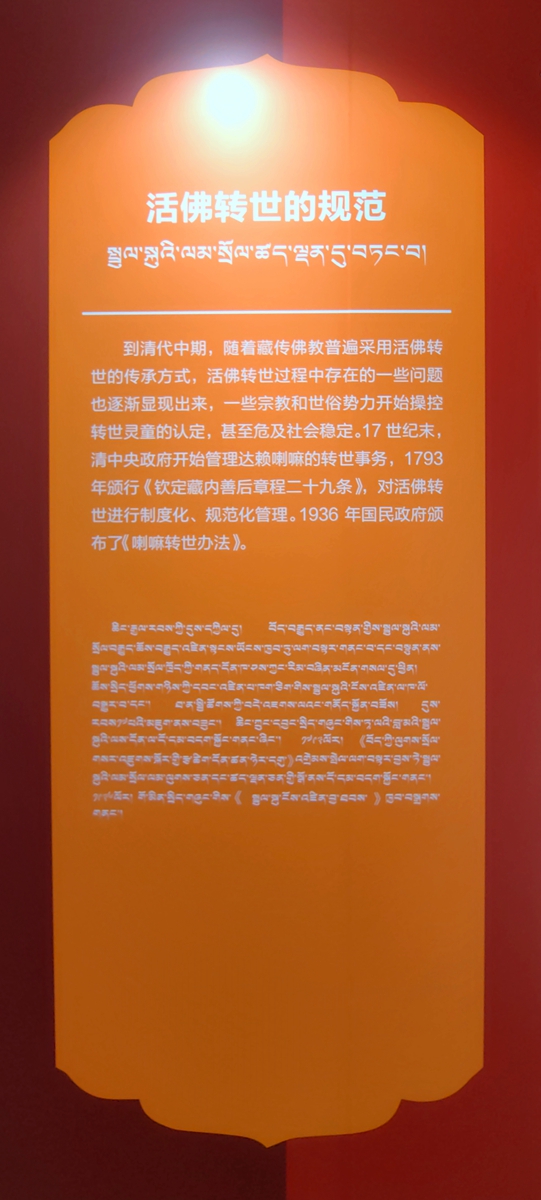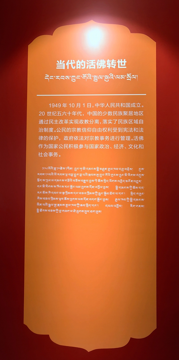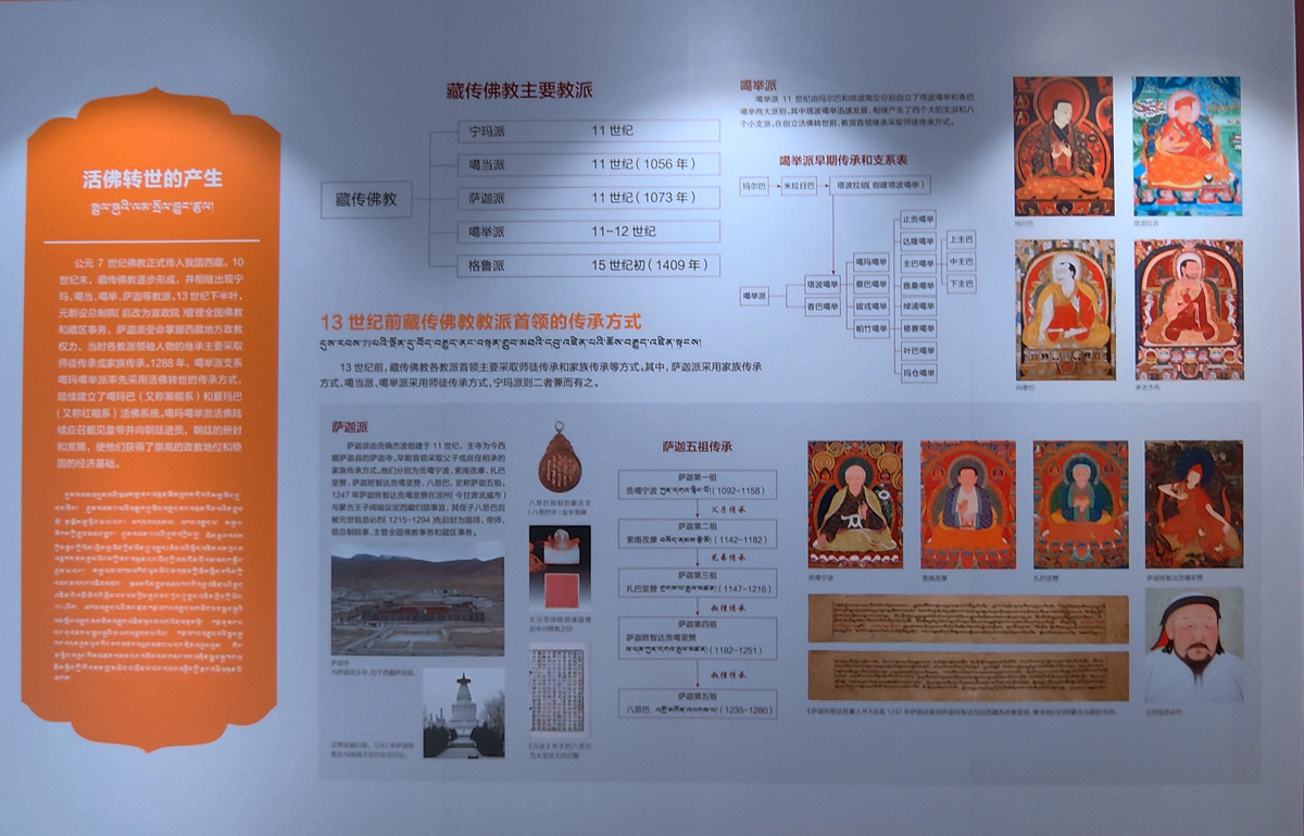 活佛是指藏传佛救一些高僧的转世,部分活佛在宗教和社会上享有较高的地位。佛教认为,一切生命由躯体和灵魂组成,躯体虽可消亡,但灵魂在六道中不停轮回转生;得道的诸佛、菩萨为普度众生可以随缘化现为各种形象。在藏语中,活佛称为“朱古”,意指佛菩萨的化身。活佛转世自 13 世纪末由噶举派创立以来,经过不断的发展,逐渐成为藏传佛教宗教首领特有的一种传承方式,形成了众多活佛系统,并陆续形成了一套比较完整的宗教仪轨和历史定制。一般而言,前世活佛圆寂后,其转世需经寻访、认定和坐床等程序。历代中央和地方政府高度重视活佛转世,并对其进行管理。达赖喇嘛和班禅额尔德尼等大活佛的转世须经中央政府批准和册封。此次展览,旨在普及藏传佛教活佛转世的知识,讲明活佛转世的产生与发展,及其认定的宗教仪轨和历史定制。