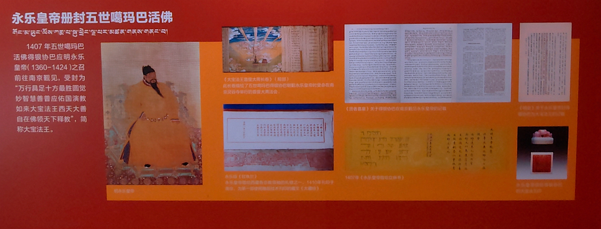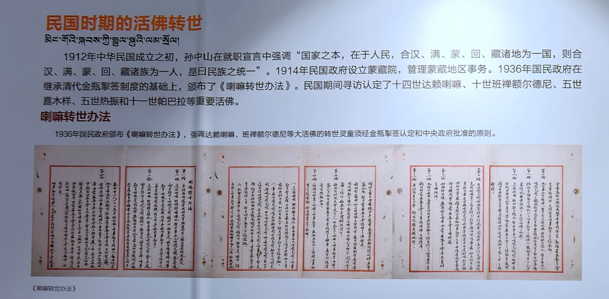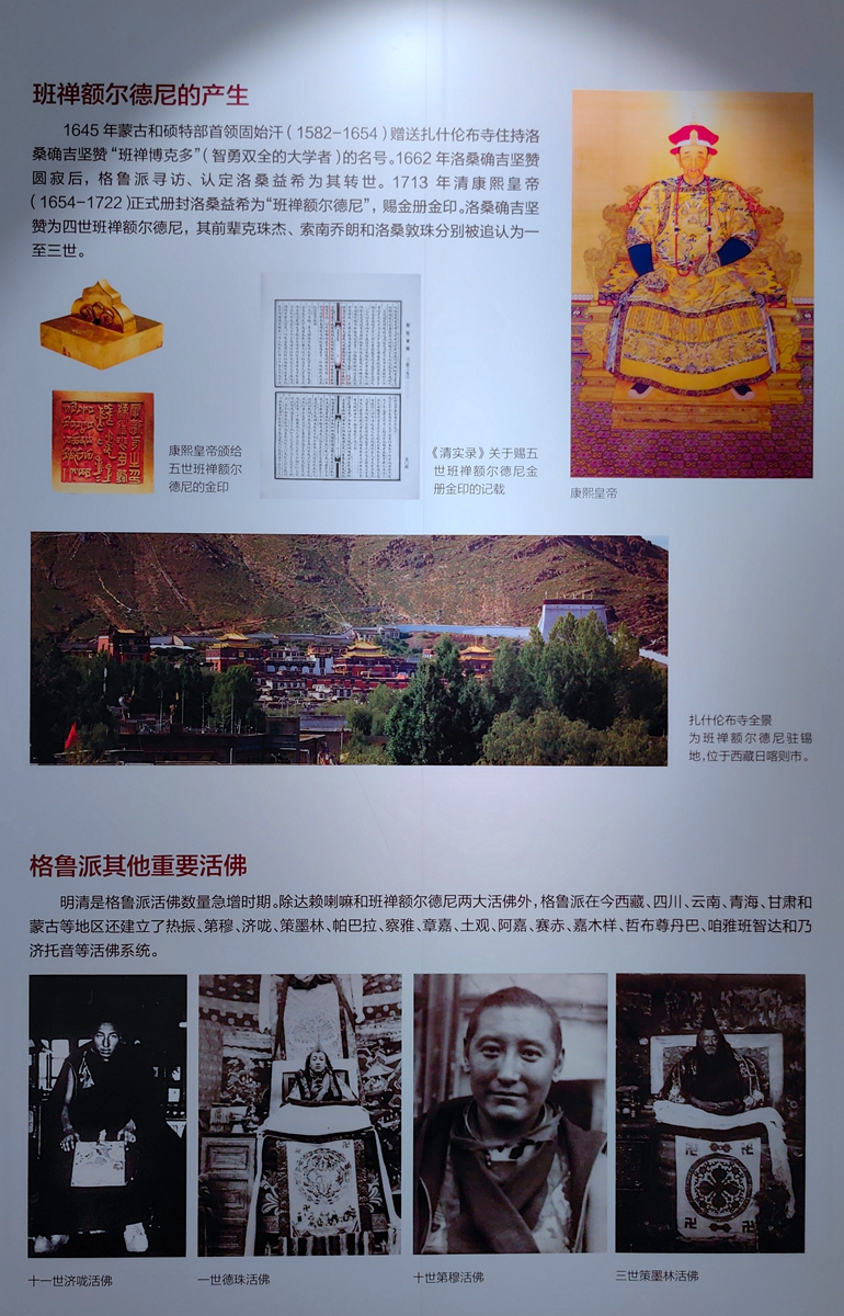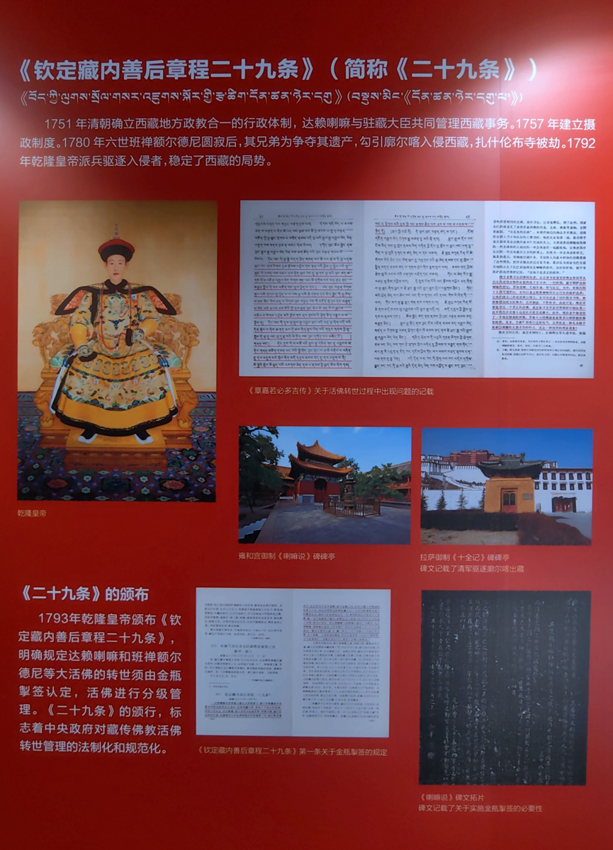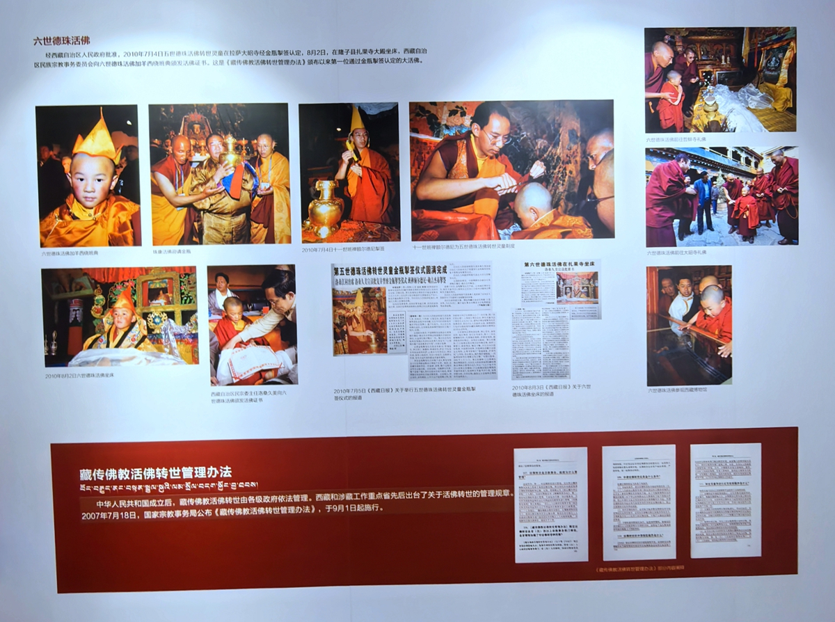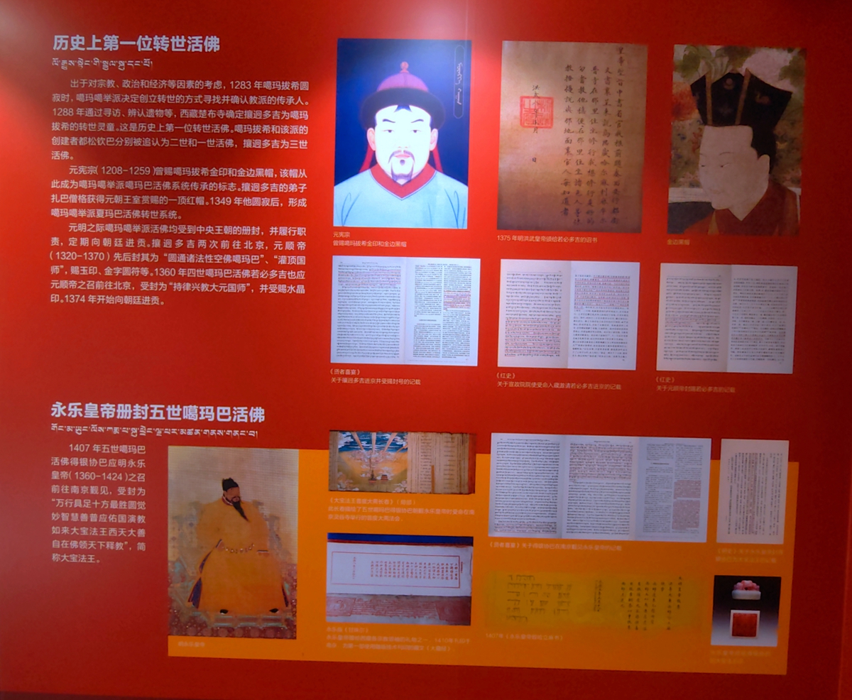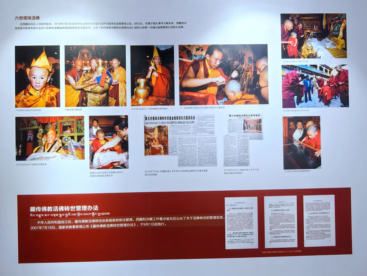 活佛是指藏传佛救一些高僧的转世,部分活佛在宗教和社会上享有较高的地位。佛教认为,一切生命由躯体和灵魂组成,躯体虽可消亡,但灵魂在六道中不停轮回转生;得道的诸佛、菩萨为普度众生可以随缘化现为各种形象。在藏语中,活佛称为“朱古”,意指佛菩萨的化身。活佛转世自 13 世纪末由噶举派创立以来,经过不断的发展,逐渐成为藏传佛教宗教首领特有的一种传承方式,形成了众多活佛系统,并陆续形成了一套比较完整的宗教仪轨和历史定制。一般而言,前世活佛圆寂后,其转世需经寻访、认定和坐床等程序。历代中央和地方政府高度重视活佛转世,并对其进行管理。达赖喇嘛和班禅额尔德尼等大活佛的转世须经中央政府批准和册封。此次展览,旨在普及藏传佛教活佛转世的知识,讲明活佛转世的产生与发展,及其认定的宗教仪轨和历史定制。