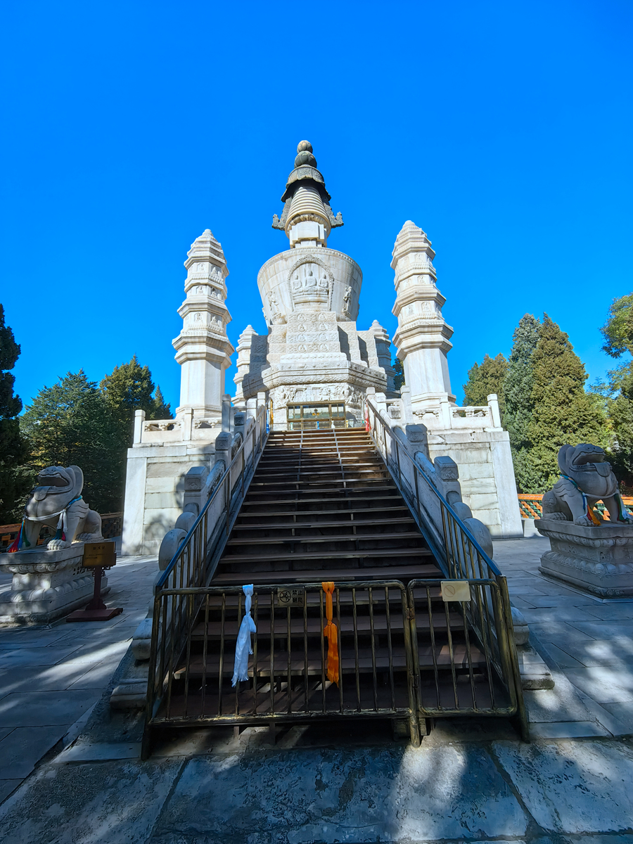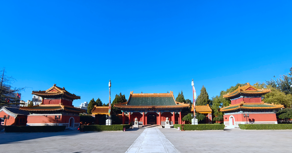 西黄寺始建于1651年(清顺治八年),集藏、汉、印建筑艺术于一体,堪称藏传佛教皇家寺院建筑艺术之瑰宝。西黄寺现存的清静化城塔院采用的是汉传佛教寺院“珈蓝七堂”的传统布局格式,共分三进落院。第一进落院建筑包括山门殿、钟鼓楼、东西配楼;第二进落院建筑包括天王殿、垂花门、东西禅房;第三进落院建筑包括大雄宝殿、清静化城塔、乾隆御笔碑亭、东西禅房、慧香阁。