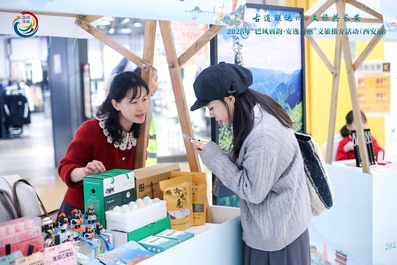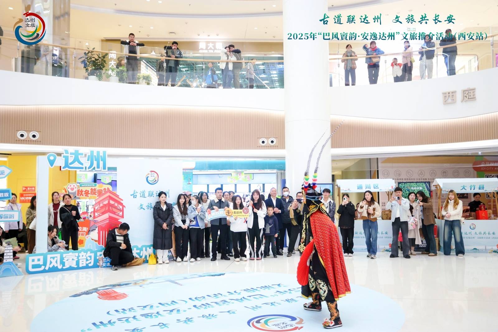 在西安大悦城核心商圈,达州文旅快闪馆以“三感体验”引爆关注:视觉上,川剧变脸、古典舞蹈等快闪节目轮番上演,吸引市民游客驻足喝彩;味觉上,灯影牛肉、七星椒、唐鸭子、旧院黑鸡、冷吃兔等非遗美食集中展销,可尝可购;互动上,“扫码抽奖”“盲猜挑战”等趣味活动人气高涨,景区门票、文创产品等文旅盲盒深受青睐,实现口碑与传播的双重裂变。
