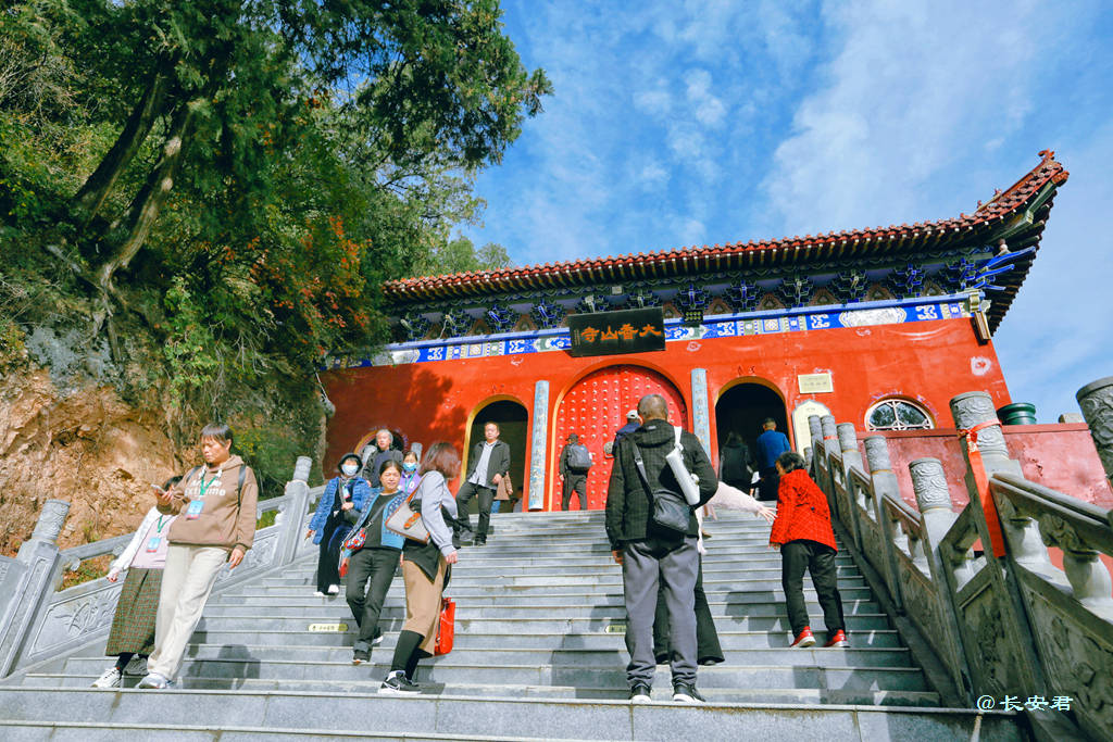 顺着红叶步道往上走,千年大香山寺逐渐清晰,红墙黛瓦被火红叶片簇拥,寺内两株千年古柏挂满金黄枝叶,树龄已超 1300 年,传为唐代高僧玄奘西行归来后亲手栽种。