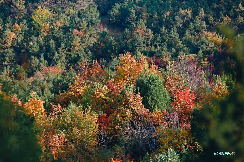 成片的黄栌把山坡染成深浅不一的绯红,深的似燃着的炭火,浅的像晕开的胭脂;零星的火炬树拔高了色彩层次,橙红的叶片在阳光下透亮如琥珀,风一吹,满树 “火苗” 轻轻晃动,连空气都暖了几分。