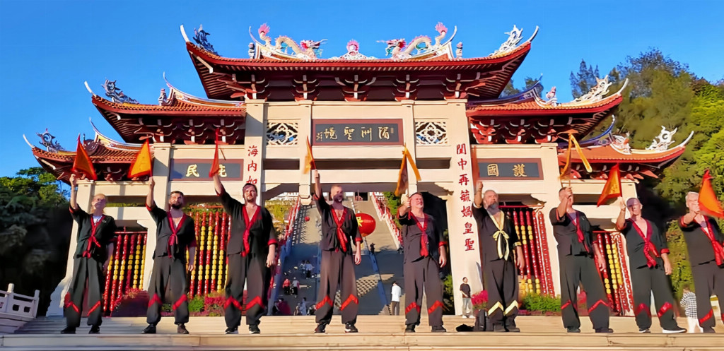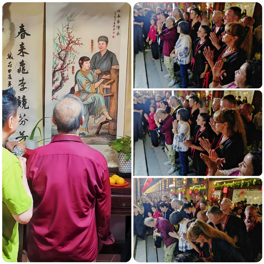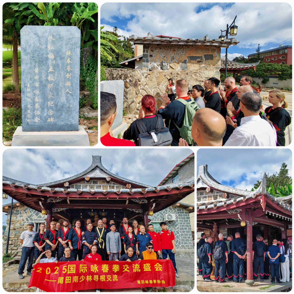 作为本次盛会的核心环节,“寻根问祖”与“宗师立碑”活动拉开了文化溯源的序幕。全球咏春弟子循着历史脉络,走进闽中天地会红花亭(保民殿)与莆田古街咏春非遗展示馆,拜谒咏春拳创始人五枚师太(俗名朱红梅:明朝皇室后裔、少林五老之一、严咏春师尊、南少林神尼)的纪念碑和传承图。不同信仰、肤色、语言的咏春传人,皆以双合掌、三鞠躬致敬先祖,完成跨越国界的文化寻根(多图组合置后,附带详细解读)。