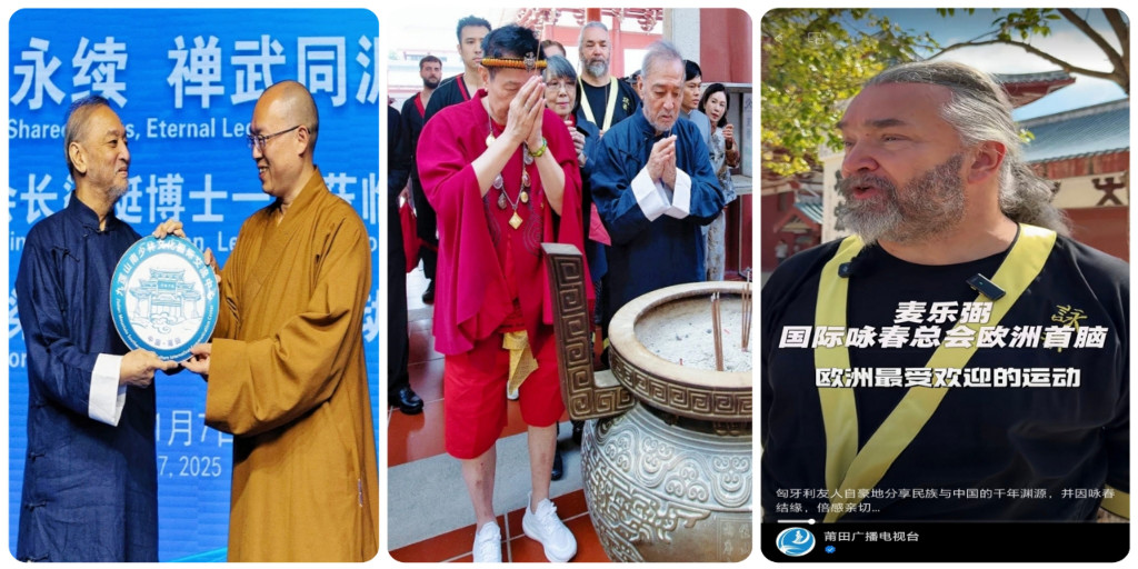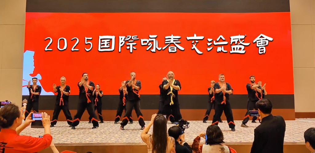 盛会期间,武学交流与文化对话多点开花,尽显咏春拳的深厚底蕴与包容特质。在南少林“根脉永续•禅武同源”的交流活动中,咏春弟子与少林僧人切磋技艺、共论武学,将咏春“刚柔相济、守中用中”的技法精髓与南少林“禅武合一”的修行理念深度交融,演绎出中华武术的多元共生之美。徐家杰教授深情陈述:“我的生命与祖国从未分离,和武术事业始终同行。看到中华武术日益强大,我深感自豪与骄傲。”