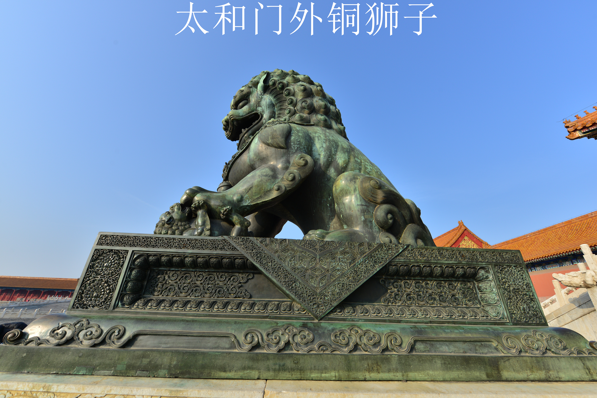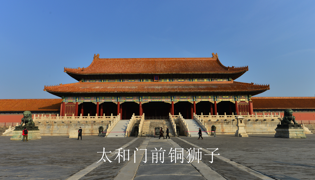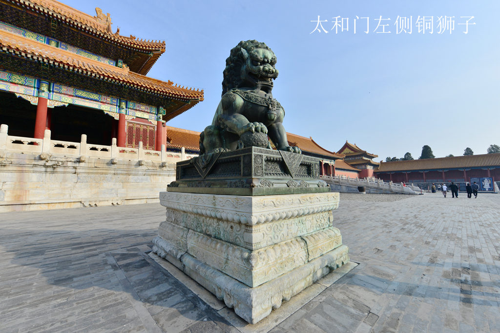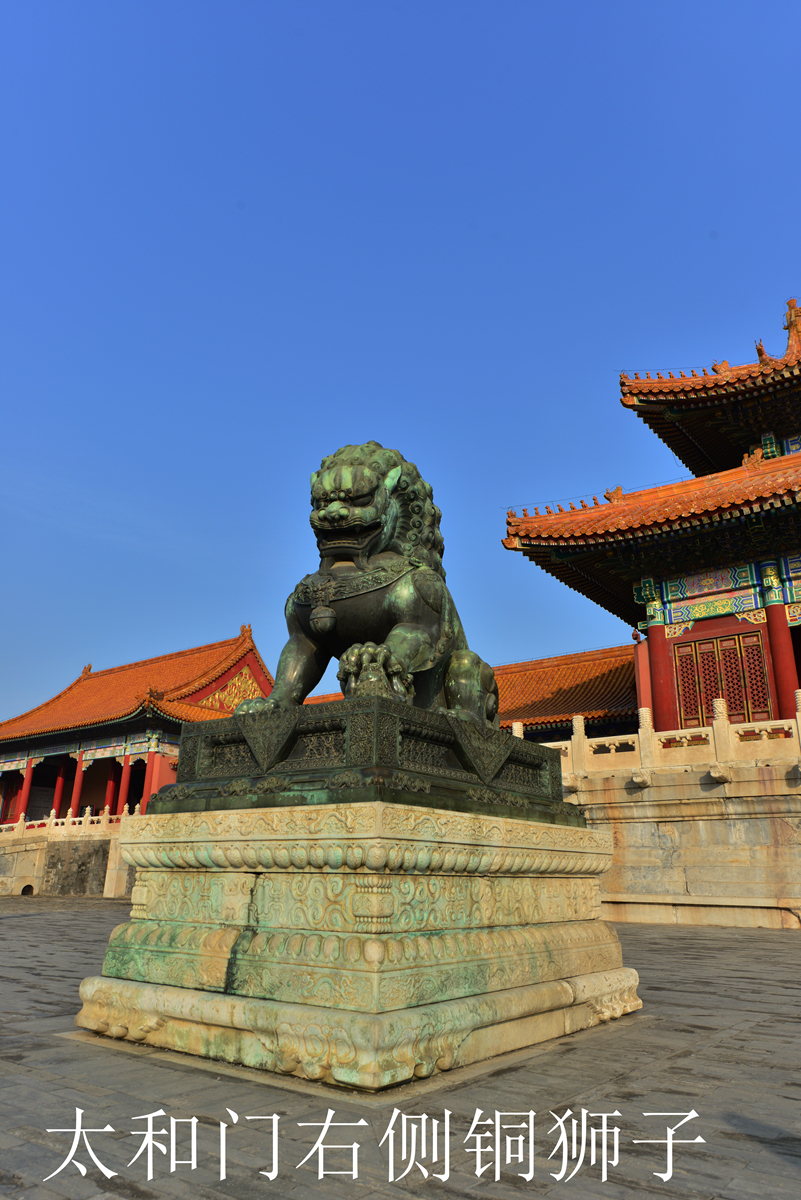 一. 太和门外的一对铜狮是故宫现存最大的一对,铜狮高度2.4米,蹲在0.6米的铜座上,下面还有1.32米的汉白玉须弥座。主流观点认为这对铜狮可能是明代的,如杜迺松先生就曾提到,从它的造型和铸制等方面推测,可能是明代的。太和门外的这对铜狮属于立耳铜狮,狮子耳朵轮廓较尖,双耳紧贴头部并警觉地竖立着。类似形象的狮子在宫中还有三对,它们形象相似又并非完全相同,在装饰纹样上有细微差别。