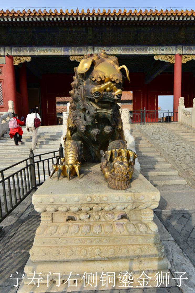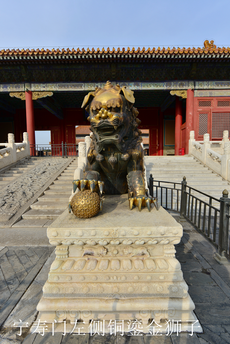 五. 宁寿门外铜鎏金狮子,垂耳,大清乾隆年造。 紫禁城中垂耳造型的狮子共有四对,除宁寿宫花园中的一对石狮子外,其余皆为铜鎏金材质,腹部有款,皆指明它们的铸造时间为乾隆年间。其中据《清宫内务府造办处档案》可知,宁寿门前的这对狮子重达7664斤,是乾隆三十六年(1771年)用观象台和掌仪司上的两座旧天文仪熔掉重做的,于乾隆四十年(1775年)安放于宁寿门前。