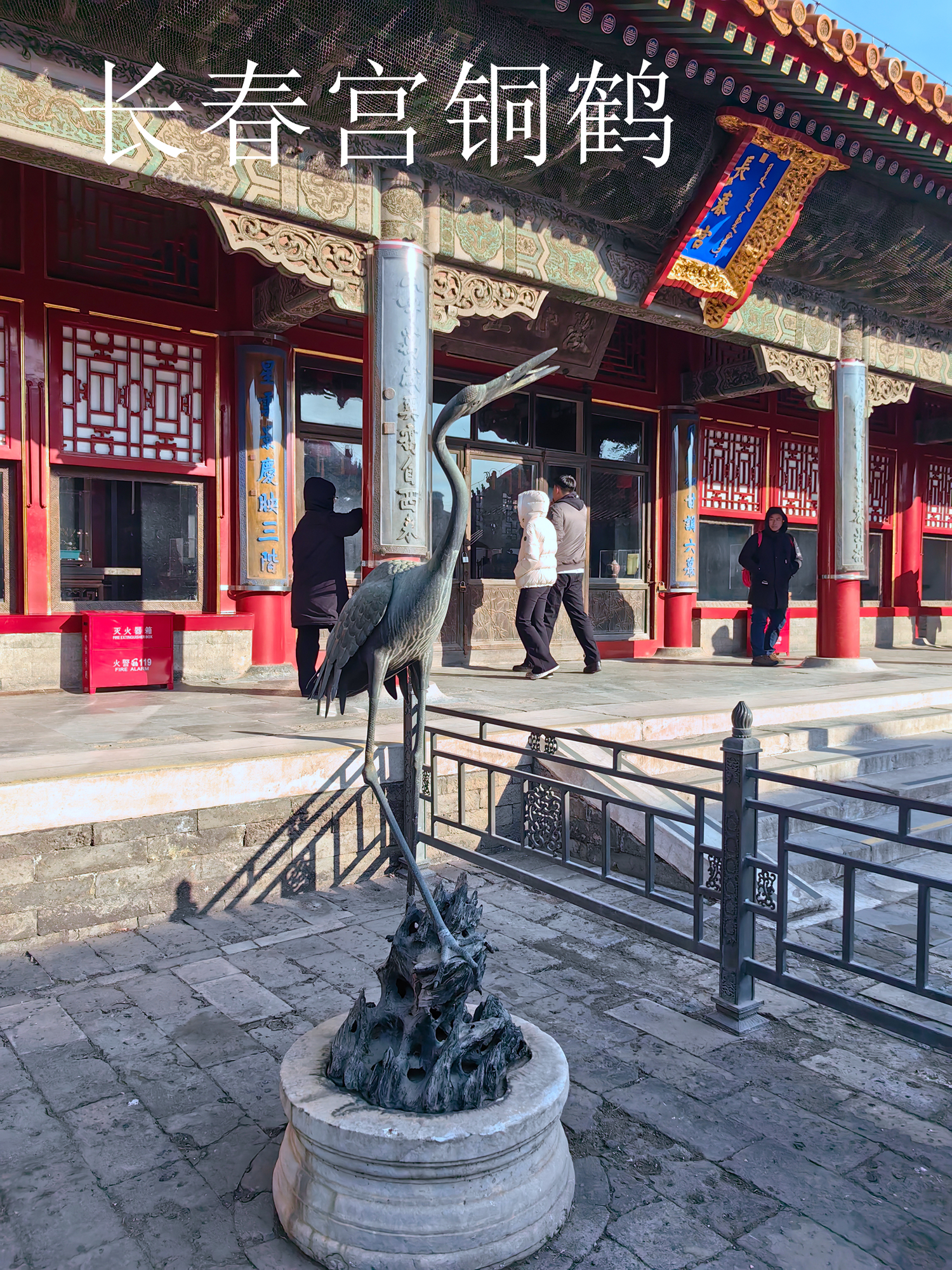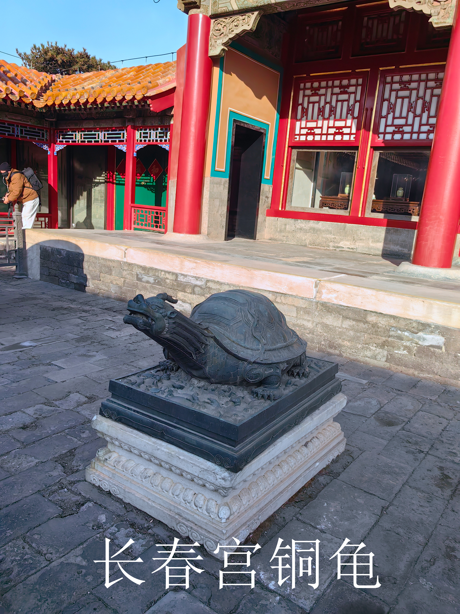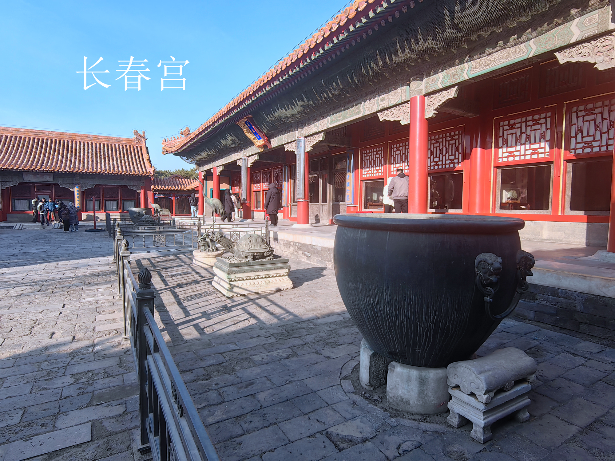 三. 长春宫外的一对铜狮也是立耳形象,其特别之处在于尺寸和摆放位置。这对鎏金铜狮含底座共高0.52米,是故宫现有铜狮中最小的一对,与其他铜狮不同,它被放置于长春宫的宫殿前而非大门前。依据刘畅和王时伟的论证,咸丰九年(1859年),曾将启祥宫改建为长春门,进而与长春宫区域合并为一个院落,这是为了方便身患腿疾,行动不便的咸丰皇帝处理政务和寝居,甚至举行小规模庆典而进行的改造。因此另有学者认为,现在位于长春宫前的这对狮子,可能原先是放置在新长春宫门前,配合长春宫前陈设的铜鹤,铜龟,铜缸以及象征权力的双龙彩绘,打造出一个兼具前朝和后寝功能的院落。(注:2025年12月26日我到长春宫游览本想拍照铜狮子,寻看院门内外不见其踪影,只看到长春宫前陈设的铜鹤,铜龟,铜缸以及象征权力的双龙彩绘,与现场故宫工作人员探寻才知,故宫出于文物保护的需要把铜鎏金狮子已经收藏文物库中,现难见芳容,期盼有一天能重回原处或在故宫其他大展中看到这对铜鎏金狮子)