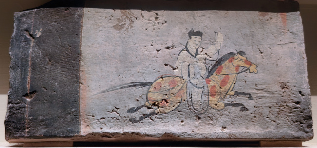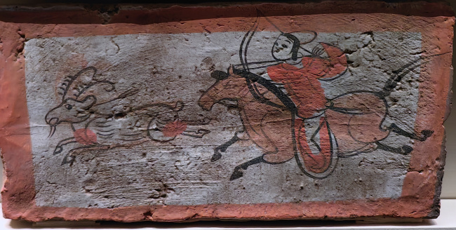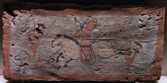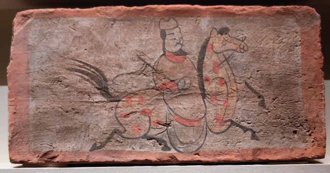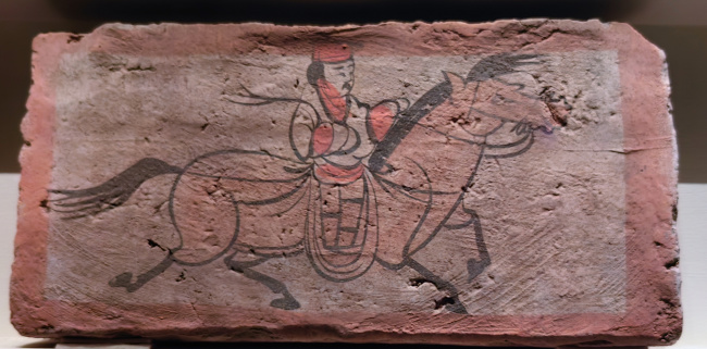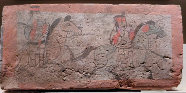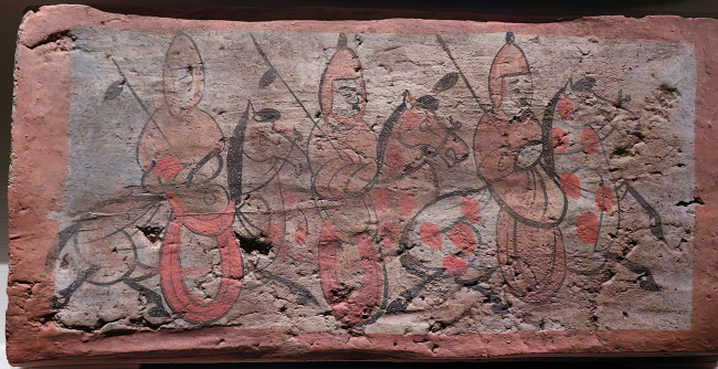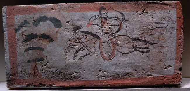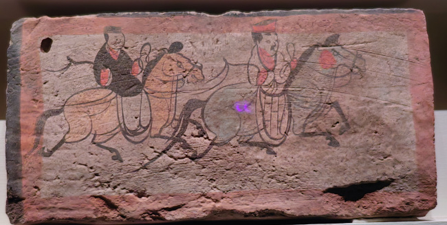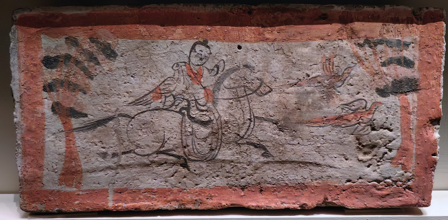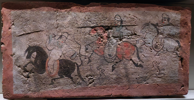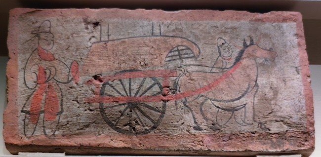 绘画技法:毛笔墨线勾勒,敷以赭石、朱红、淡黄等矿物色彩,属于设色画像砖。