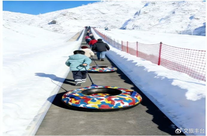 【魔毯雪道】雪场的超长魔毯是玩雪的“黄金搭档”,拉着雪圈就能轻松上坡,不用费力攀爬,老人小孩都能轻松驾驭。