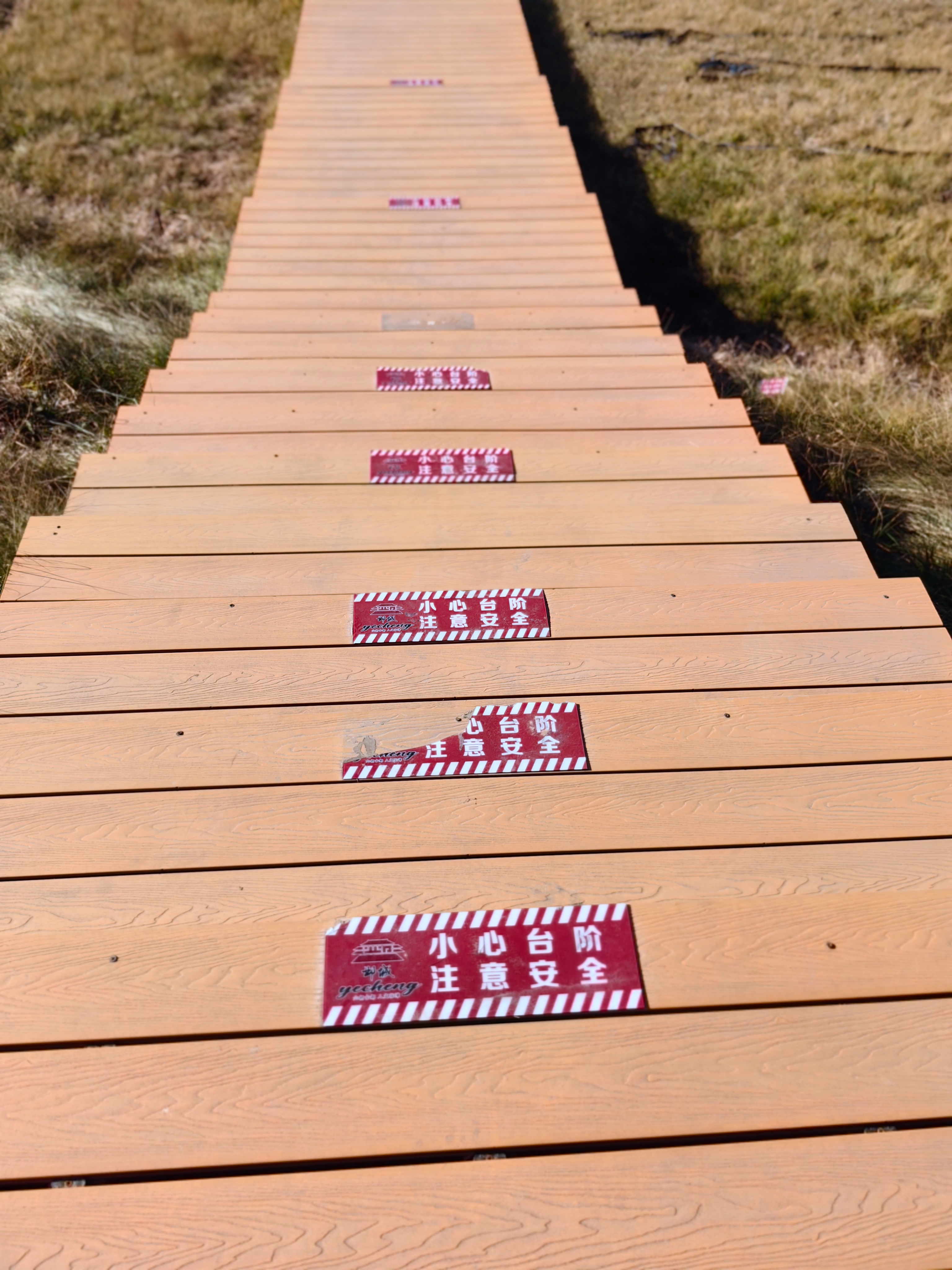 木栈道标识着小心台阶注意安全,用的是非常滑塑料制品(也可能是有机玻璃)与提示事与愿违