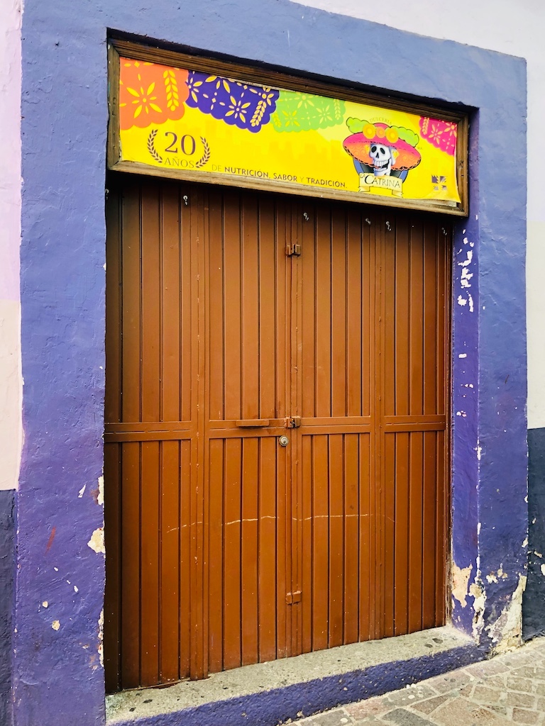 街道的两旁布满各式各样的大门,由于明天就是墨西哥一年一度的盛大节日:亡灵节,因此节日气氛浓厚,以骷髅、亡灵为主题的装饰充斥着整个城市的各色商店,既惊悚又有趣~