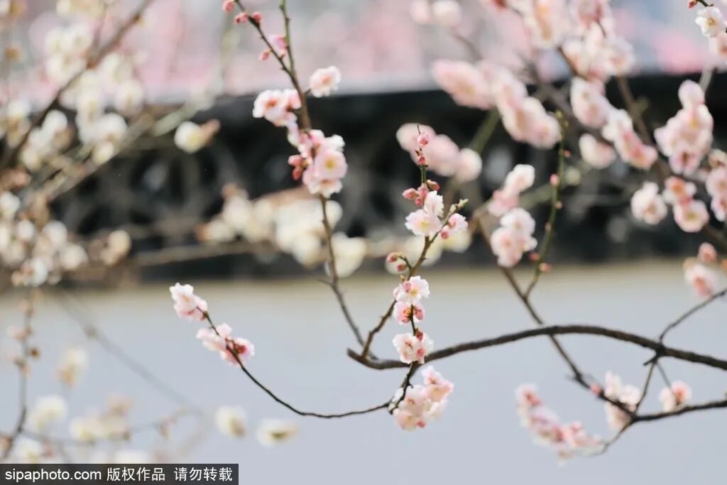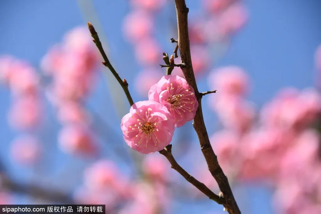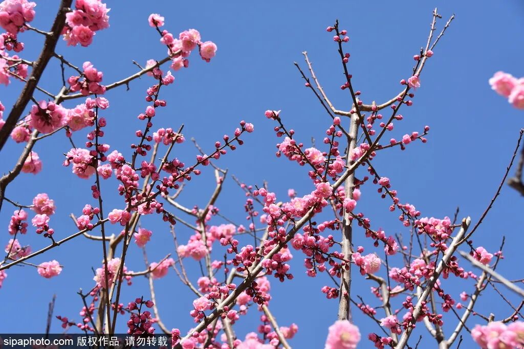 大观园内盛放梅花与蓝天相衬,上演治愈“粉蓝色”