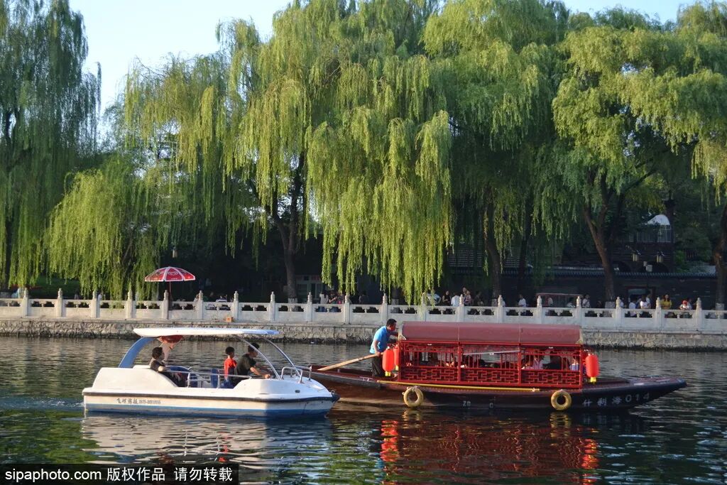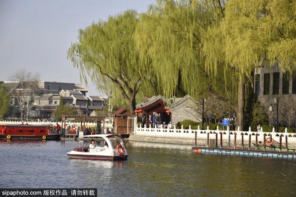 春日泛舟什刹海是件惬意的事情,暖暖的阳光铺洒在湖面上,绿水清波温柔地荡漾着,周围的民居与翠柳相映成趣,仿佛徜徉在古色古香的画卷之中。