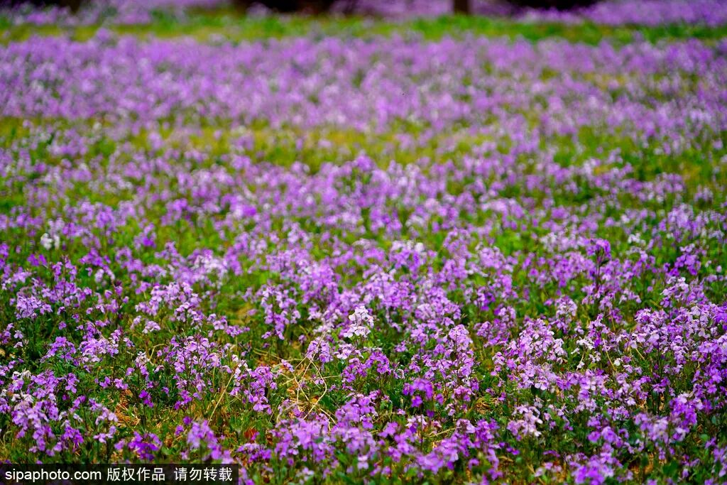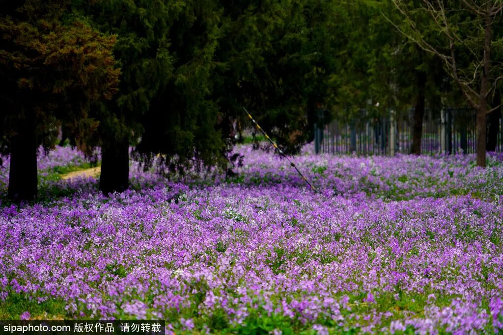四月初,天坛公园迎来二月兰的盛放。一簇簇淡紫色的小花接连成片,掩映在红墙间,依偎在古树旁,一眼望去犹如给大地铺上了一块紫色的花毯,如梦如幻。
