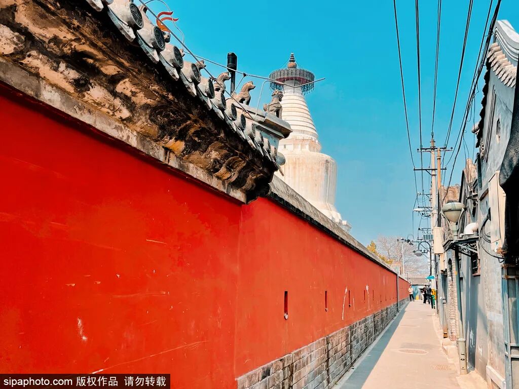 寺院的周围是纵横交错的胡同,漫步其中,抬头即可望见白塔。历史的沉寂和现代人的生活气息,就在这里融为一体。