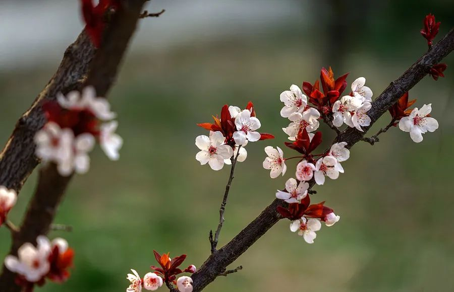 因其叶子终年为紫红色,故称“紫叶李”, 有“紫气东来”的寓意,花语为幸福、向上、积极。