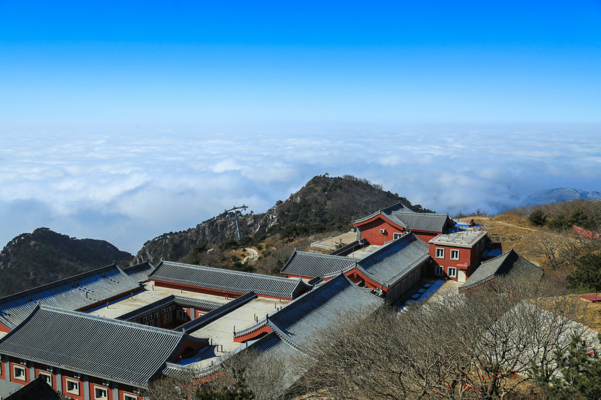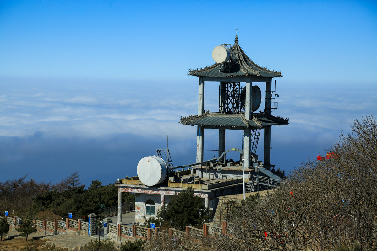 俯瞰处,云海与残雪的白色交融成片——云涛是流动的白,残雪是凝固的白,二者在阳光下交相辉映,将远峰、古松都洇染成水墨轮廓。