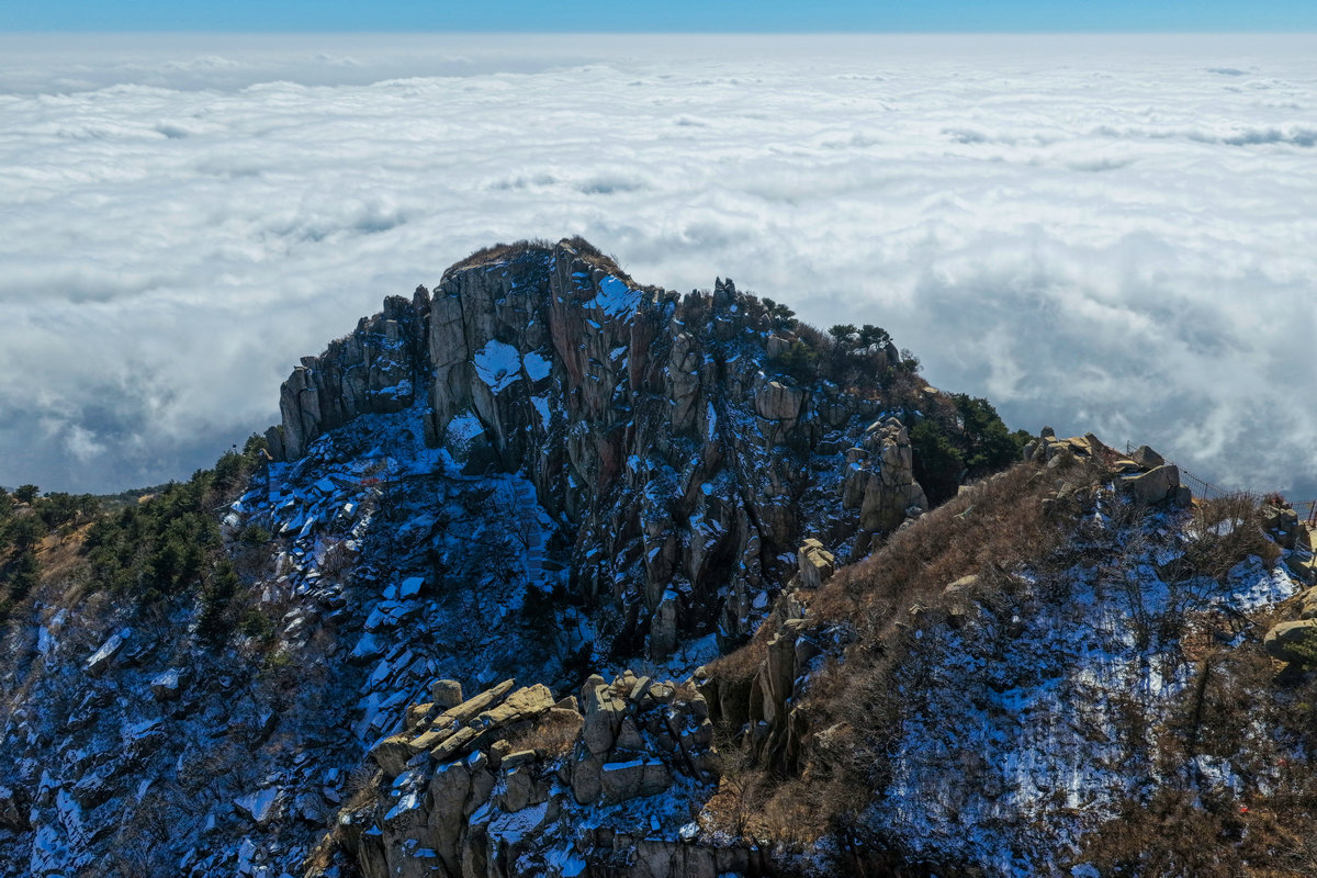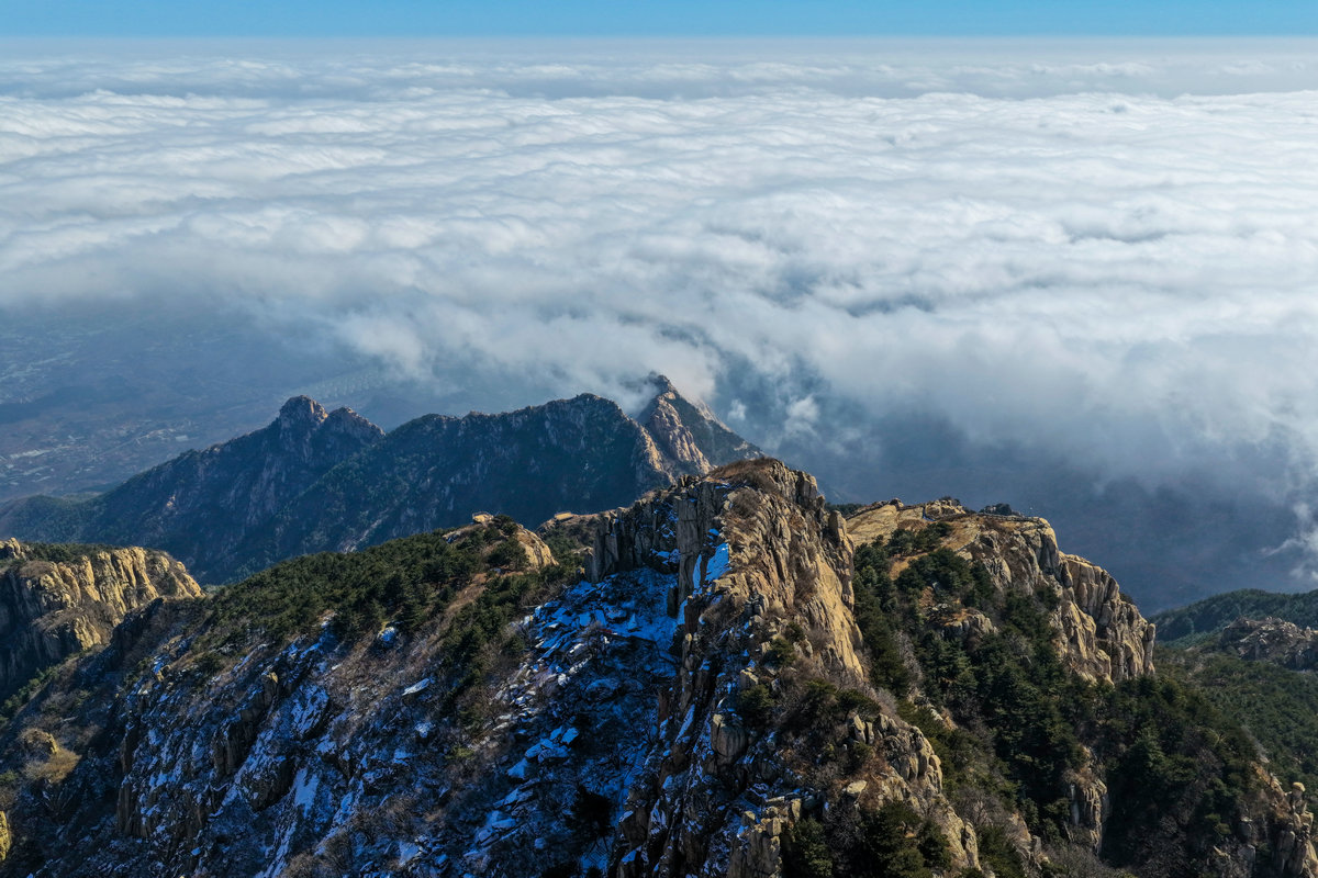 山腰处,云海正以千匹素练之姿翻涌,那无垠的白色与山间尚未消融的残雪遥相呼应,恰似一簇巨大棉絮在天地之间共舞。