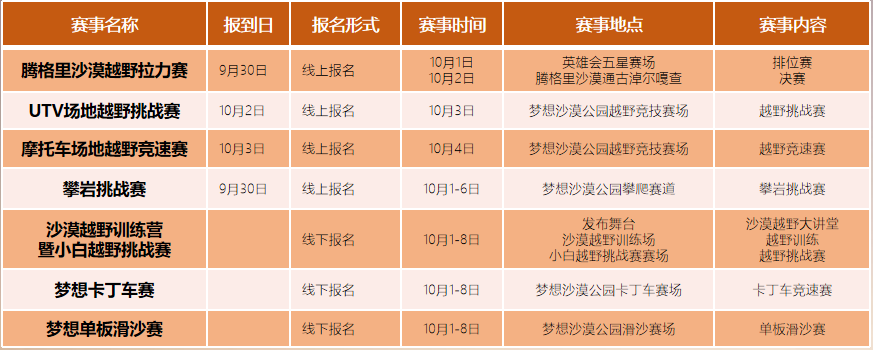 9月30日:赛手报到/行政检验/车检/赛事说明会(梦想沙漠公园赛事中心)